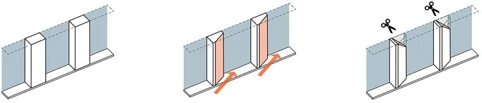 参数化的峰丛曲线作为基准线,设定每条格栅的长度,并且通过格栅的单向弯折来实现宏观上的三维曲面效果。