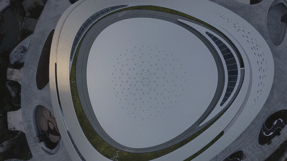 动感流畅的银色建筑犹如时空穿梭中的“星际战舰”,连接幻想与现实,融合建筑与环境。