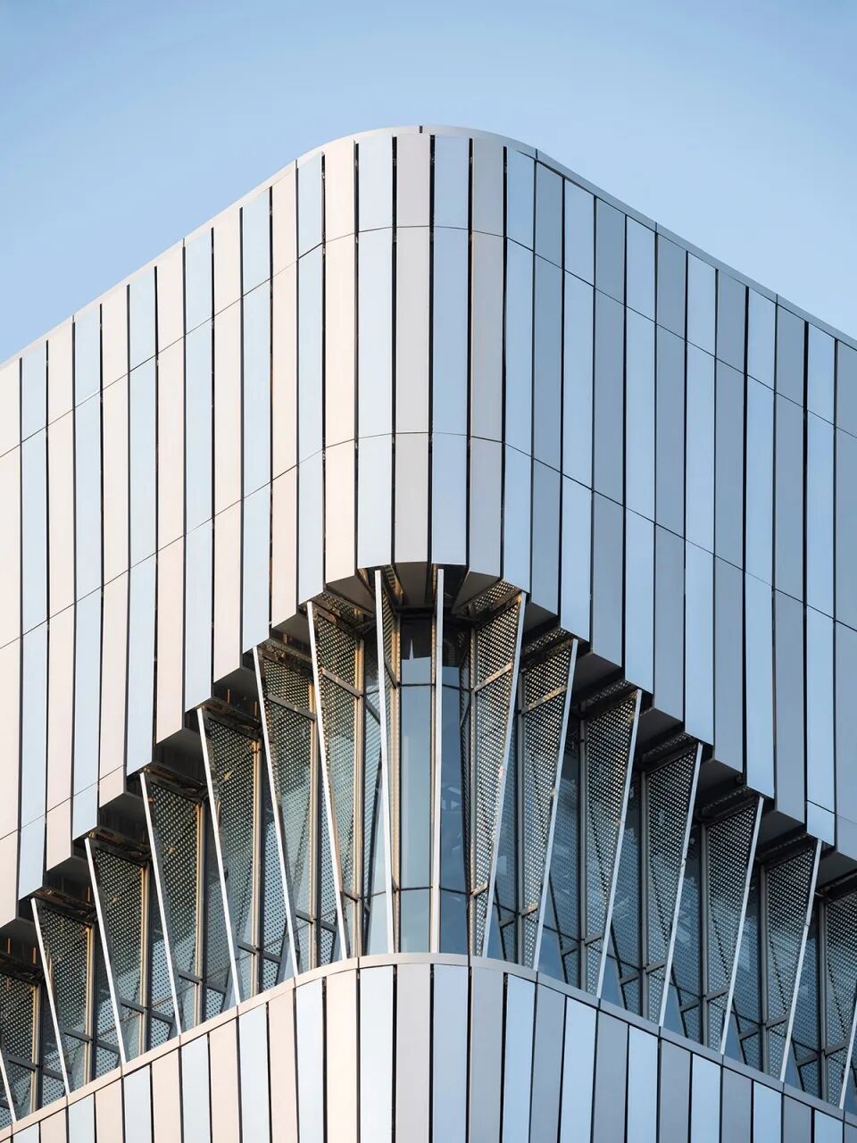 铝板幕墙采用镜面和哑光两种铝板格栅相间布置,形成强反射与弱反射的交替节奏,以条带化的抽象反射将周围环境映衬在建筑表皮之上。