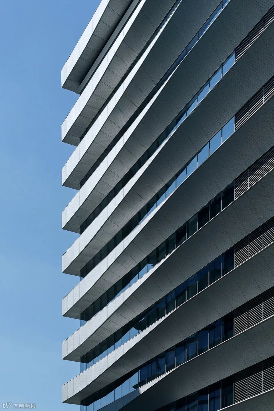 浙江桐乡巨石科技大厦,雨棚主材是阳极氧化铝板,由两片三角折板完成塑造,与大楼整体的切面手法对应,非对称的处理在各种光线下都能透出浑厚的金属光感。