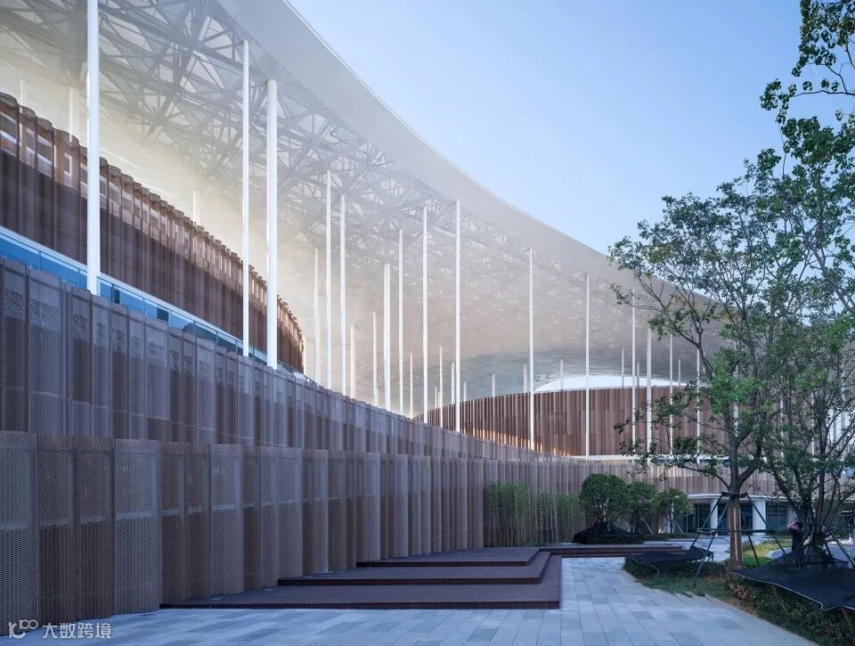杭州亚运会棒垒球体育文化中心二层公共平台的建筑立面以弧形穿孔铝板材料营造水波连绵的江南意象。