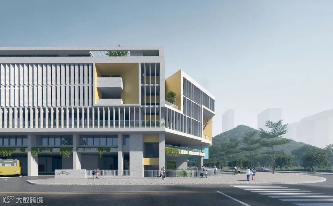 建筑南北立面,侧遮阳竖向构件,间距避免过度遮挡教室视野及采光。西立面百叶随着内部办公、厕所等不同功能要求,百叶有韵律的偏转,利于西晒遮阴,又隔绝西侧工厂干扰。