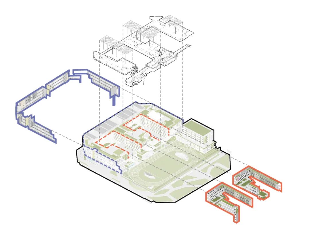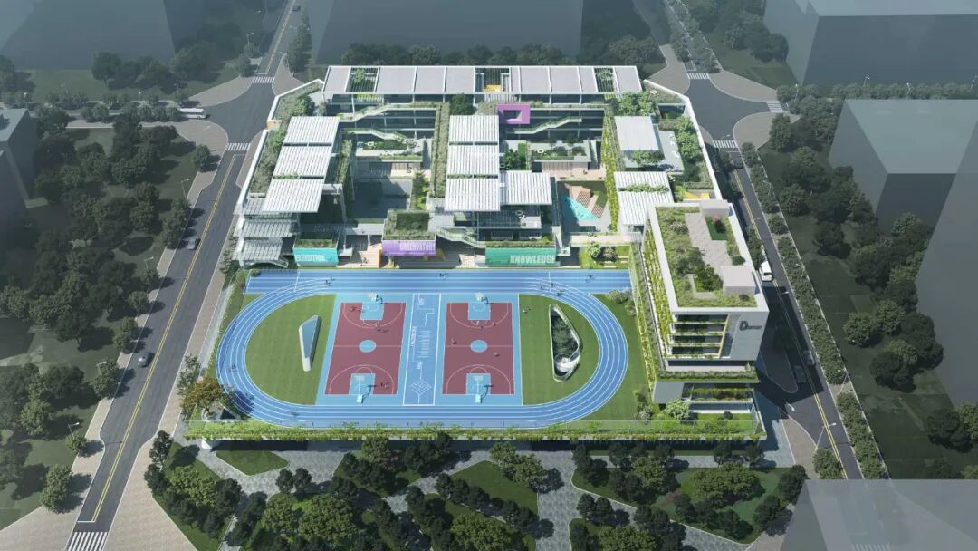 学校主要教学空间及操场架空抬升,底层灰空间内外、公私合理分区,部分区域向城市打开,校园可充分链接城市公园绿廊,社区也有效共享校园体育运动、报告厅等校园设施。