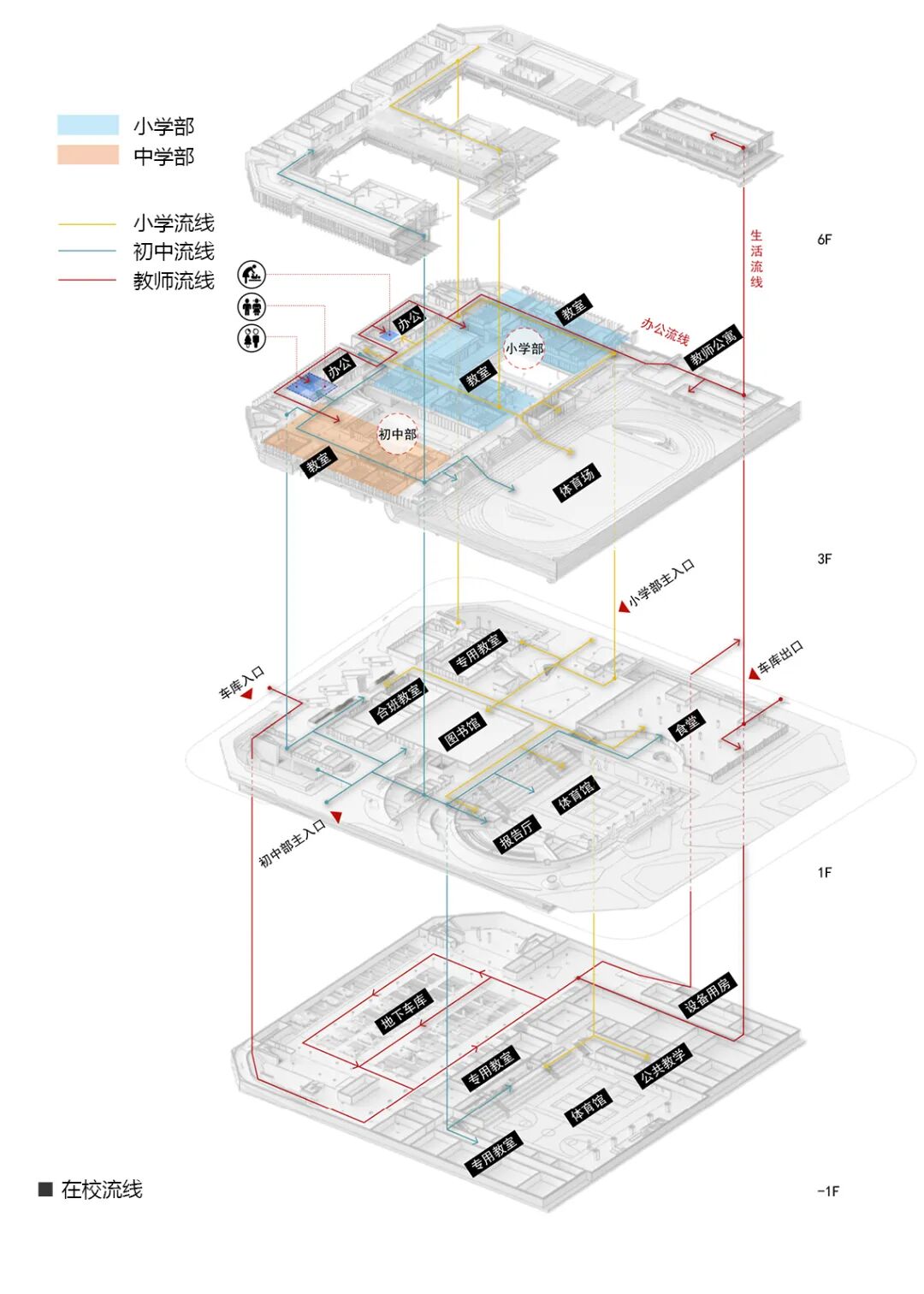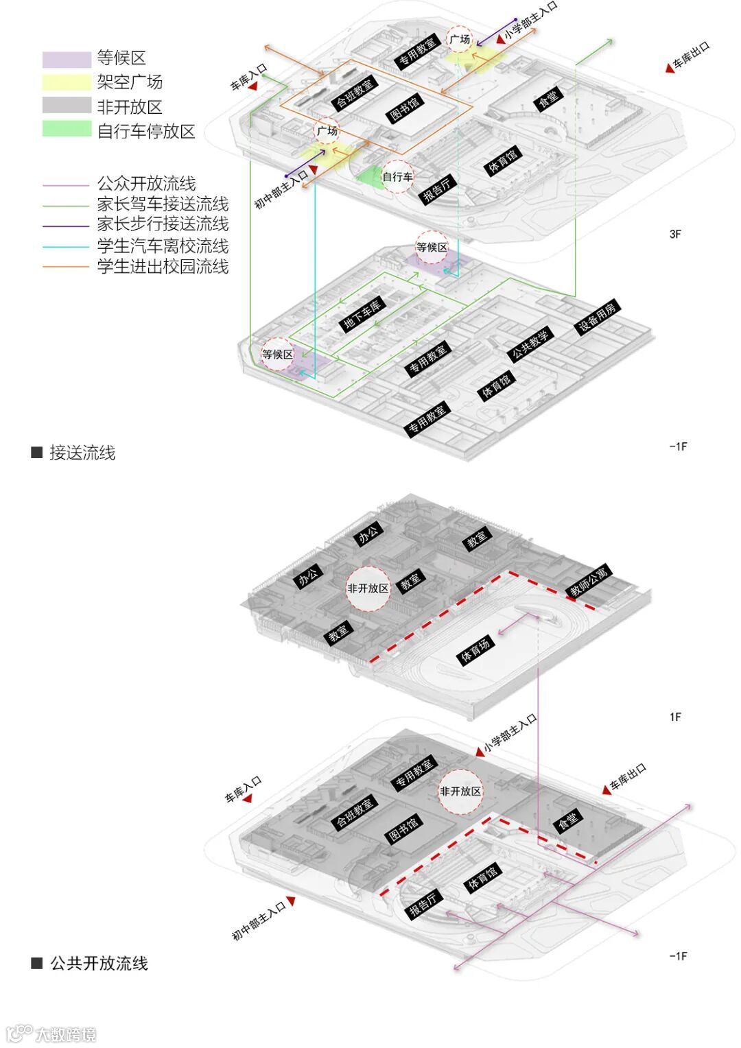 入园及离校流线充分考虑不同接送类型:乘公交或徒步上学人群,结合校园入口架空广场,实现家长和学生无风雨等候和集散。驾车接送流线,结合下沉庭院独立的等候区与地库相连,接驳港上下车后,通过就近楼梯抵达各教学用房,人车分流保障接送安全。