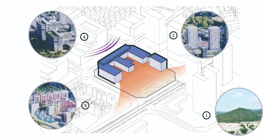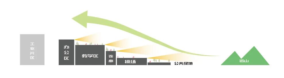 西侧高层厂房干扰较大,建筑布局三面围合,将教学空间与工厂及喧闹的街道隔离,朝西侧城市公园和远景火山公园,空间开敞通透,将绿廊视野引入校园内部。