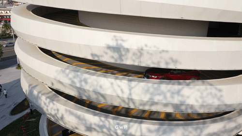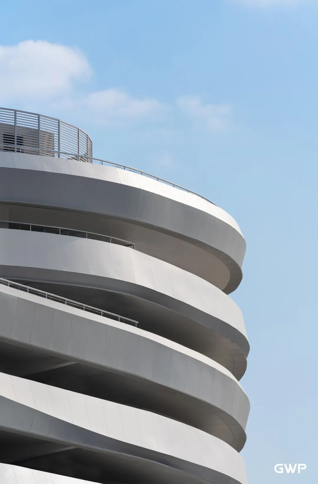 另一方面基于使用者的驾驶心理,设计师在建筑的西南段采用了极富表现力且节省空间的螺旋坡道结构,形成一条独立于驶入流线的驶离捷径,将车辆高效快速地从一层引入六层,大大提高了停车的效率,迎合了使用者快速通行的需求。