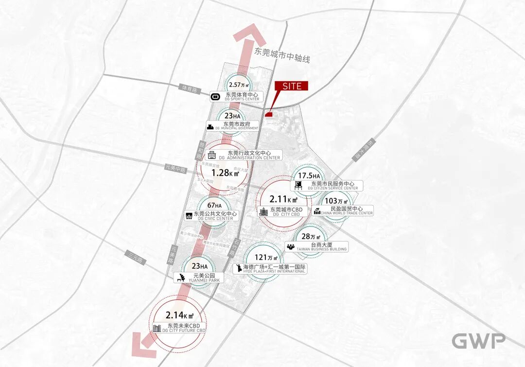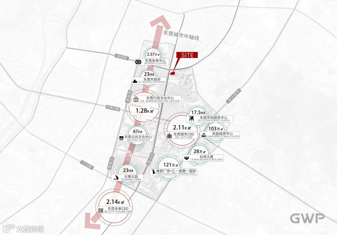 项目位于莞城区石竹路与体育路交界处,属于东莞市一心两轴的重点核心城区,通往东莞市政府的直线距离约200米且周边城市功能及路网成熟,具有很大的城市可视视角。