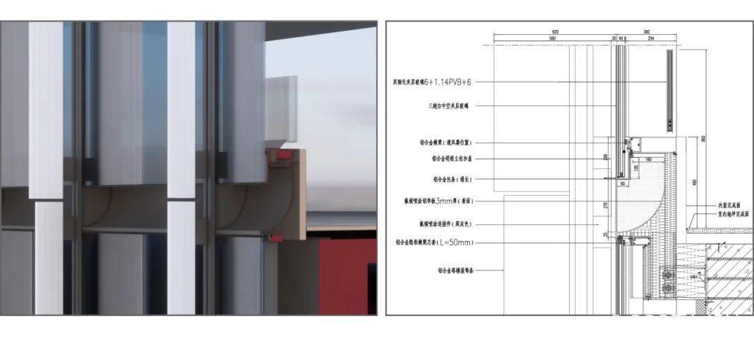 进一步关注到材料的工艺及细节作法,外侧玻璃往下延伸,背后打胶不断缝,在不影响通风效率情况下将通风槽隐藏起来。铝版折边尺寸控制在约30mm、调整杆件连接件的位置以及装饰杆件的细节,在细部尺度下将幕墙做到极致。
