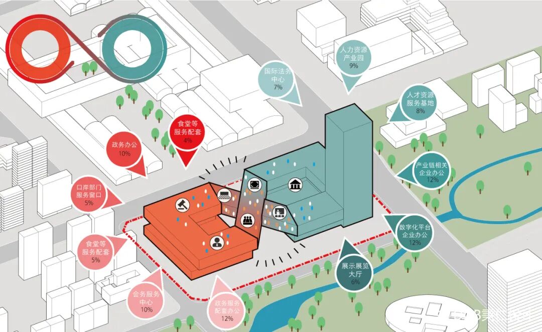 项目主要功能由政务服务中心、展示展览、法务、口岸、人力资源、会务中心及商务办公等组成。
