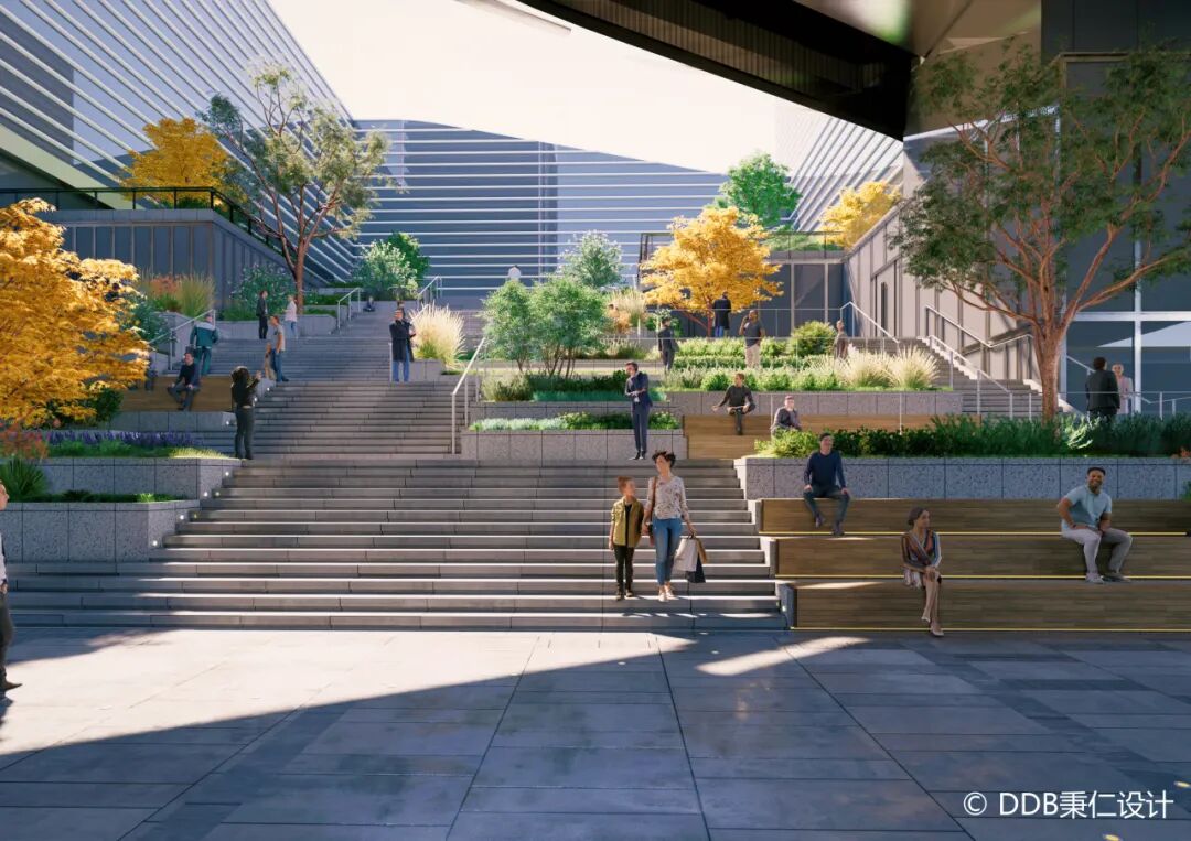 广场城市客厅——由地面连接至中庭花园的立体城市广场,积极回应城市联系需求;