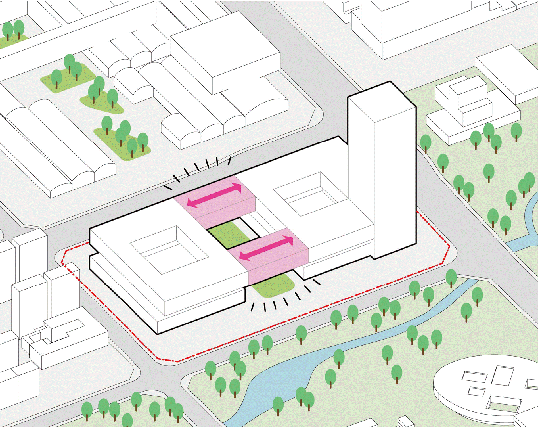 透过地下衔接地铁及城市公园,地面向城市中轴开放,