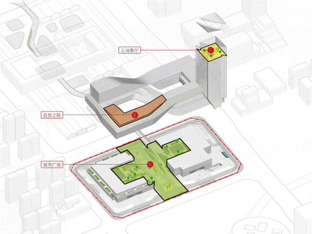 我们整合政务中心与其他资源功能,打造超级自贸综合体的整体形象。