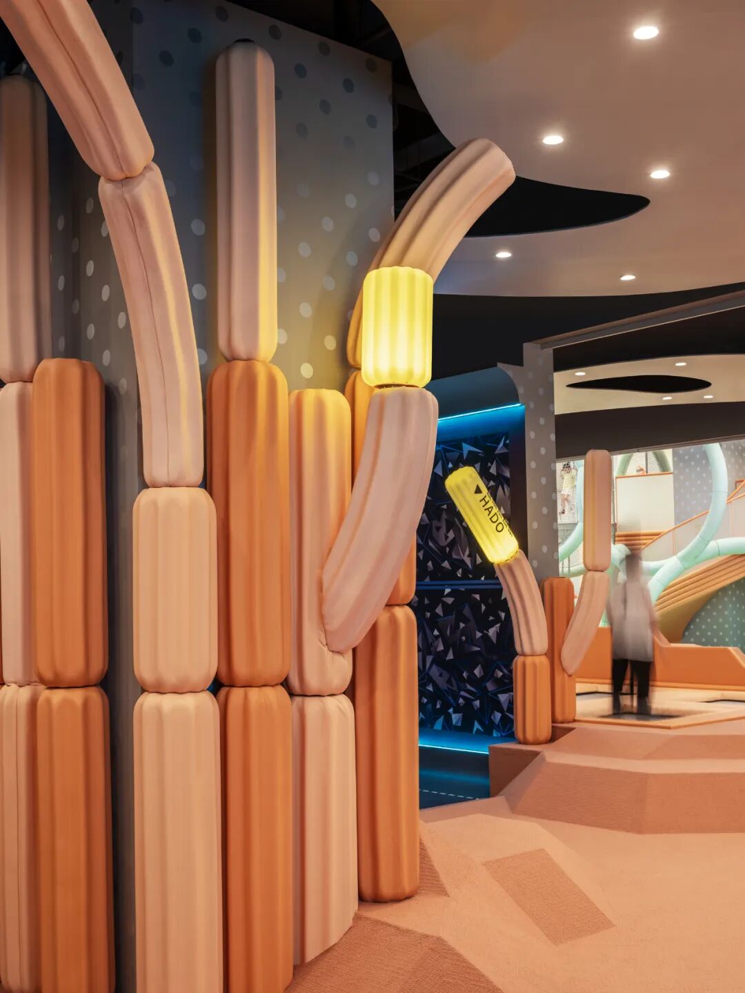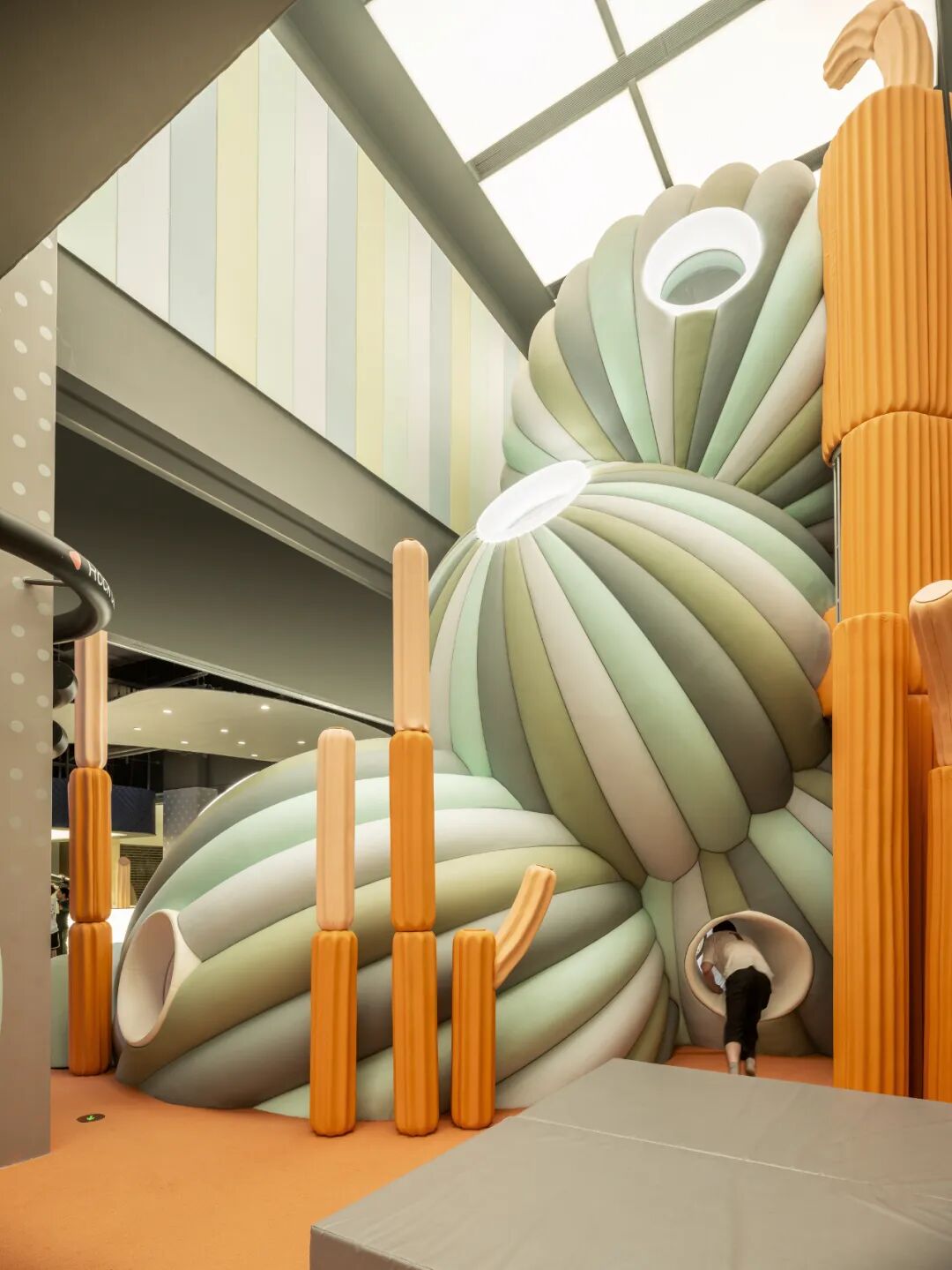 c) 仙人掌立柱:利用仙人掌立柱的垂直形态,将其作为家具元素均匀分布在整个空间中。软垫模块从家具中凸起,并被用作设计工具,以支持直观的游戏功能,包括攀爬点、摇摆的臂膀和台阶,或更高的观察点。作为规划工具,仙人掌立柱可以用来划分不同区域之间的元素,作为视觉导航系统,并通过单一模块化元素实施了功能照明的固定装置。