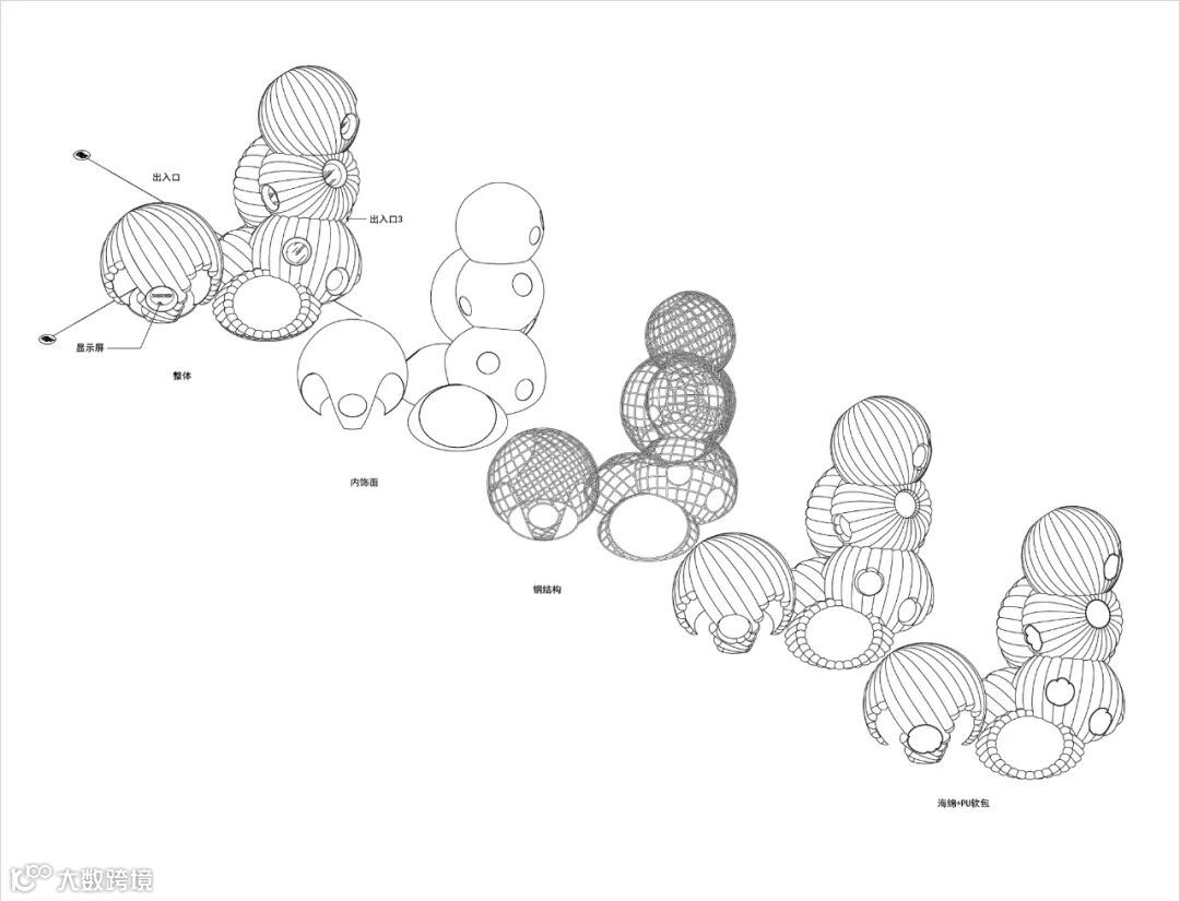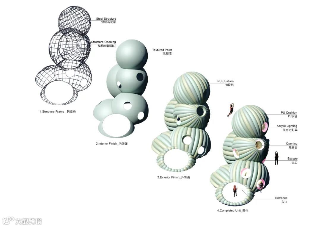 a) 仙人球:利用七个球形形体之间的相互关系,我们将室内改造成一个大型的探索工具,让家庭成员锻炼攀爬和爬行的能力。桶形球体内部的结构排列形式是一种投射到球体表面上的网络状结构。在需要的地方,额外的独立柱被用来支撑内部游戏,同时也可以探索桶的周边,所以探索的过程也形成了额外的活动。