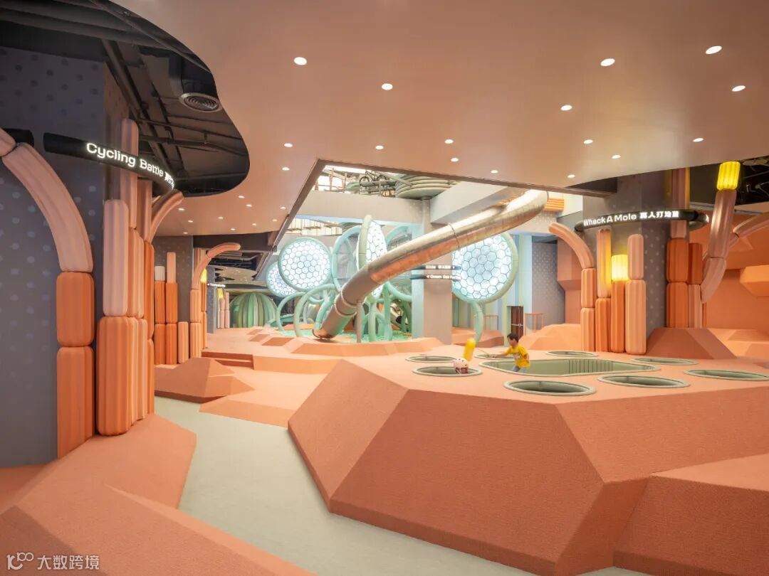 b) Hoop Cactus: We have optimized the structural morphology of the cactus and referenced the spatial relationships found in cellular structures. Using 28 circular rings with diameters of 4.14 meters and 3.1 meters, we have constructed two symmetrical spatial structures each arranged in a radial manor. Constructed with prefabricated steel tube sections the frame is welded into place and clad with cushioning with each loop split into 12 segments. On this Loop framework, we have incorporated horizontal climbing nets, slides, high-altitude training elements, and decorative lighting. It serves as the primary framework within the space, supporting and positioning the main vertical play facilities