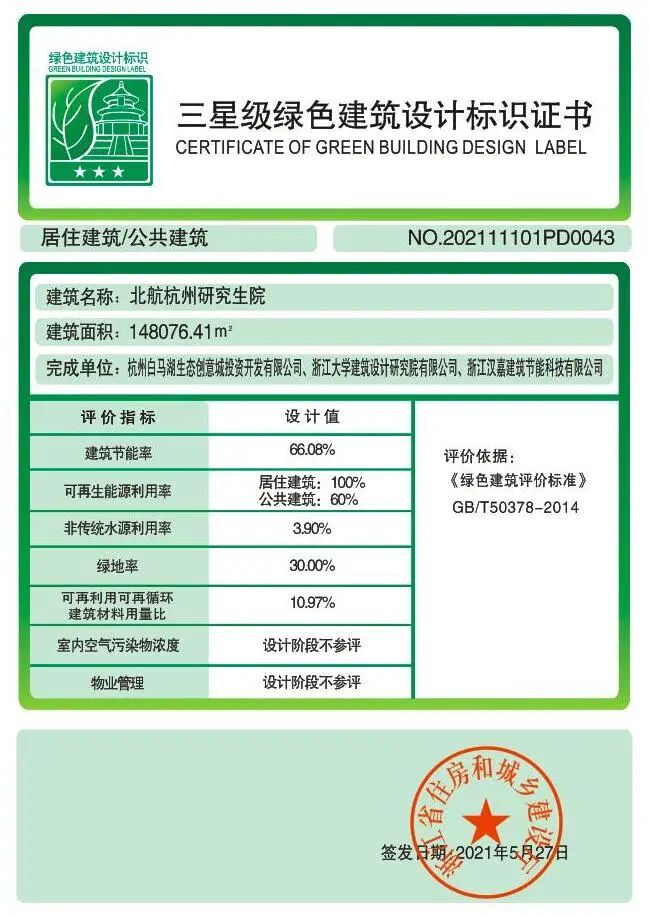 北航杭州创新研究院设计中运用了多项先进的绿色建筑设计策略,确保内部使用的舒适性和能耗的降低。项目设计完成后整体取得绿色建筑三星级设计认证,成为杭州最早取得绿色建筑三星级设计认证的工程之一。