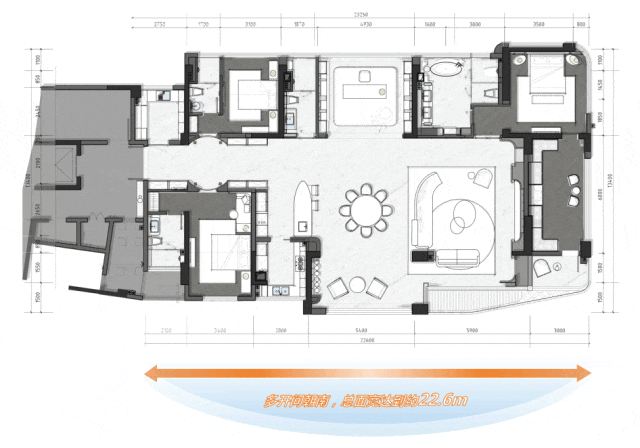 无主柱设计的格局满足了开敞通透的体感要求,呈现“无边界”的居住体验。