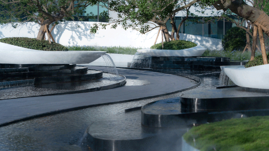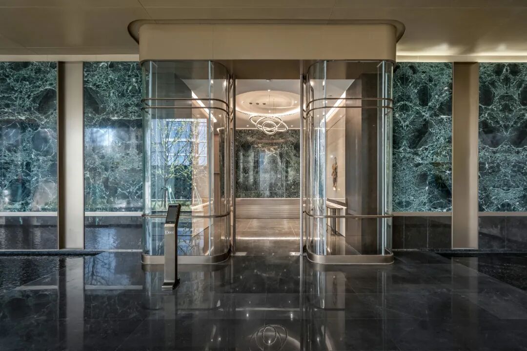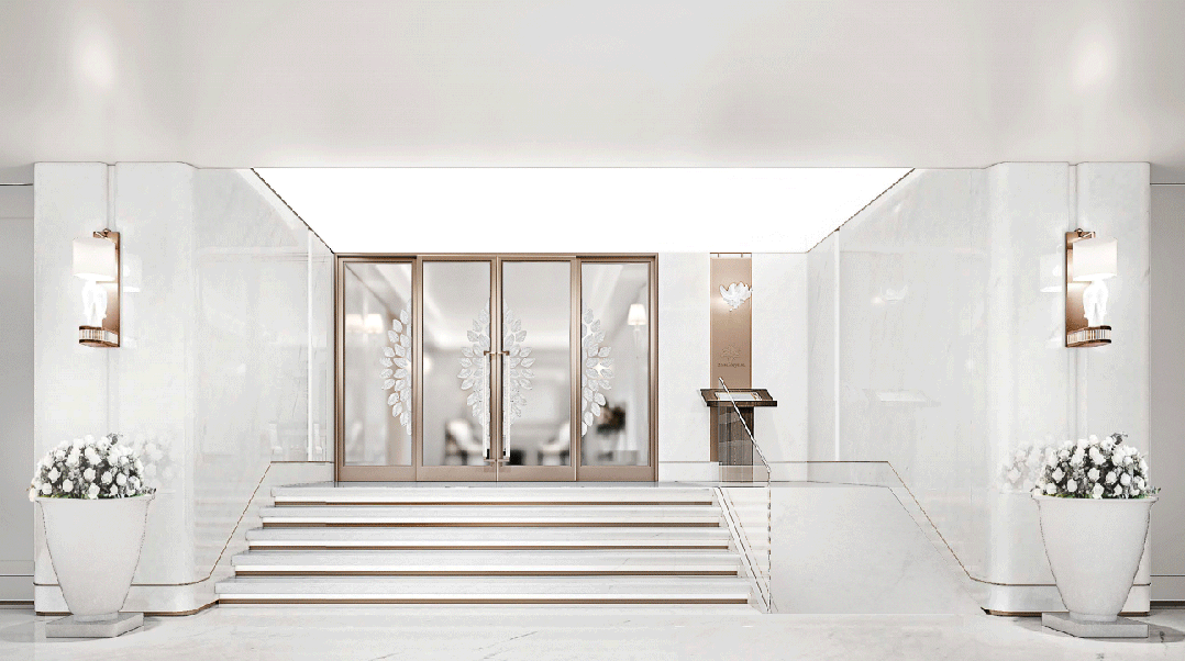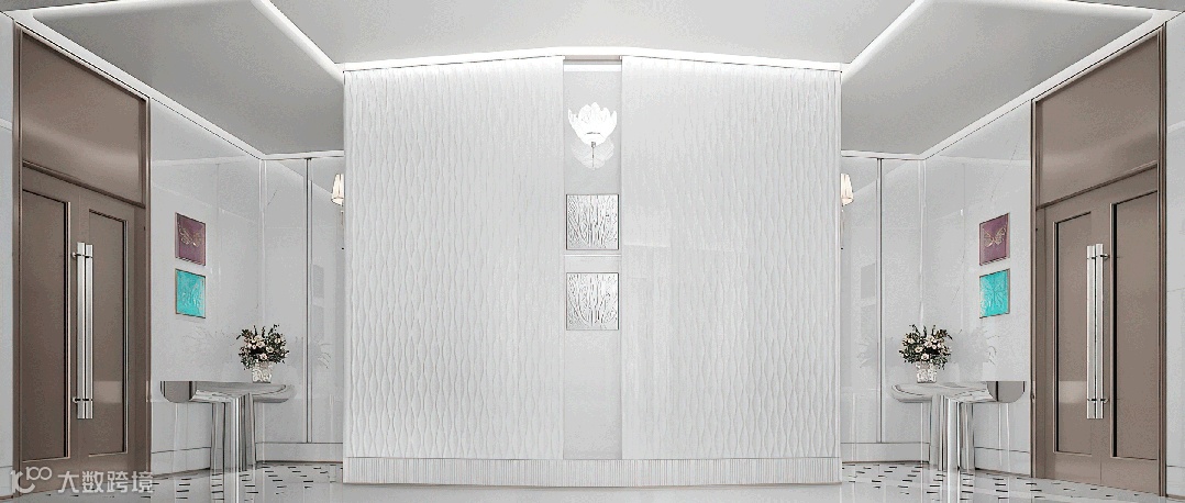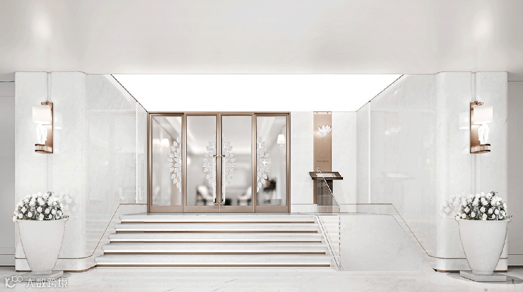 再看甄选定制的安曼灰大理石与弧形板、独具仪式感的酒店式环岛落客区以及潺潺不绝的时光水盘,沉稳高奢之感油然而生,最终得以呈现艺术、高级且兼具气场的效果。