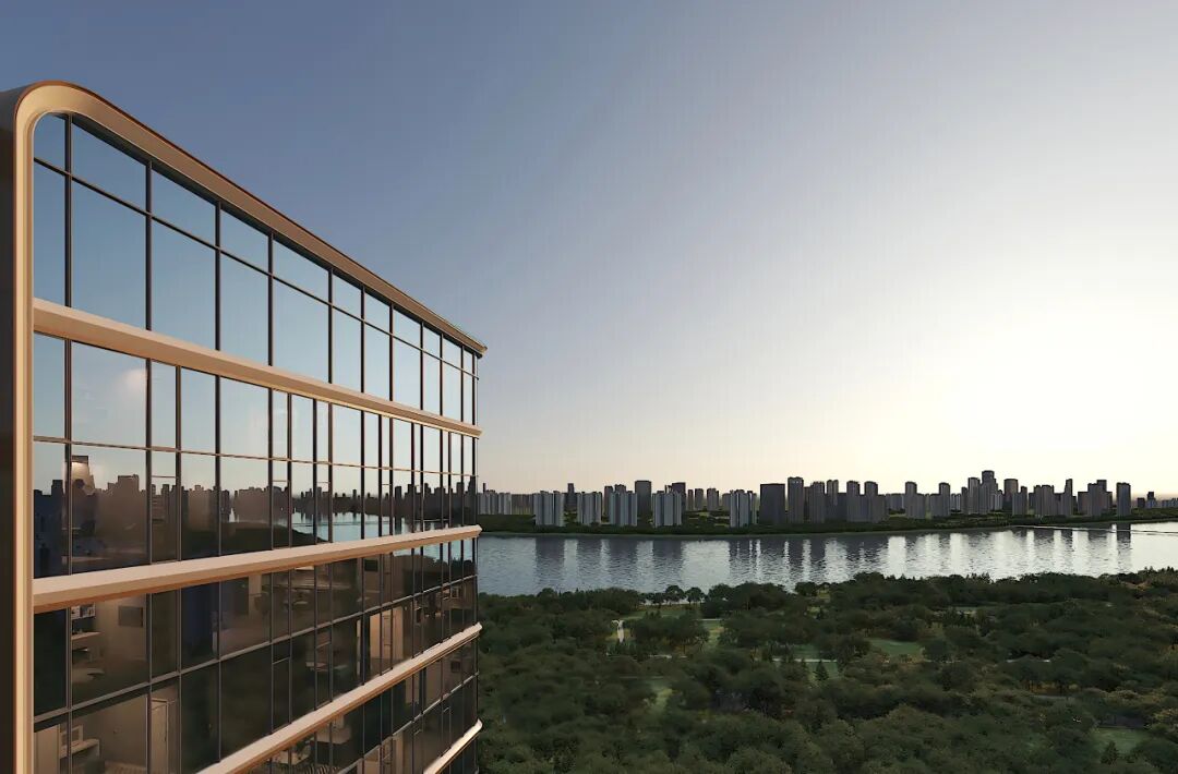 D10天誉在外立面上打破了市面上常规的门窗分隔,大比重选用玻璃+铝板线条,将视觉界面拓展到「270°全画幅」,使室外景观以超广视角进入室内空间,打造“天空客厅”般的感受。