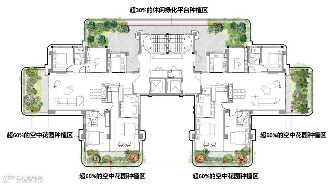 空中花园绿化率达到60%,公共平台绿化率达到40%,采用自动化灌溉系统,确保绿植常年水分充足。