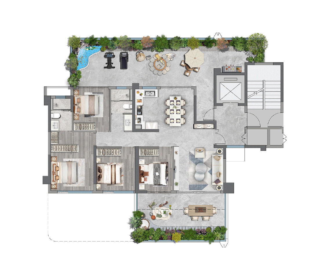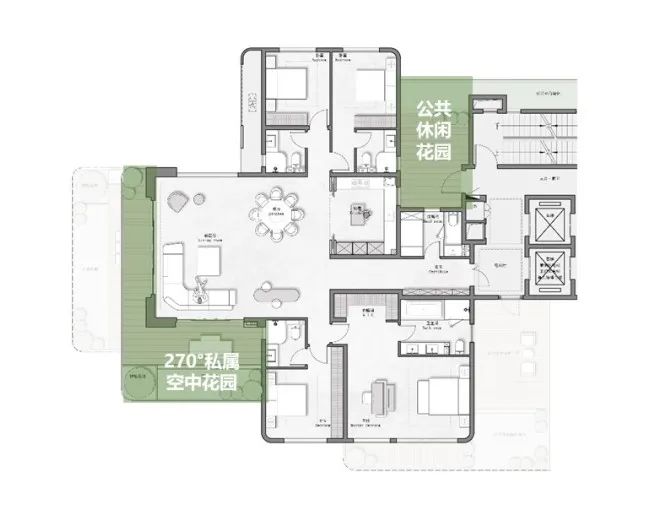 公共休闲绿化平台 ——内凹式巧妙设置公共休闲绿化平台,与户内空间完全脱开,既不会对户内造成遮挡,又与核心筒公区直接连接。超乎想象的户外空间面积,令其功能和场景更为多元化,真正实现生态住宅的花园生活。