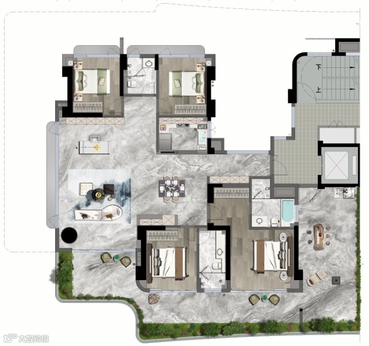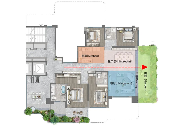 户型横向和纵向两个方向都设置了规整的方形庭院,不同于以往L形庭院,庭院空间更完整、尺度更舒展,绿化面积更集中。而且能够让住宅被植物完整包裹,形成360度超大景观视野,透过客厅或者房间,都能有庭院深深的既视感。