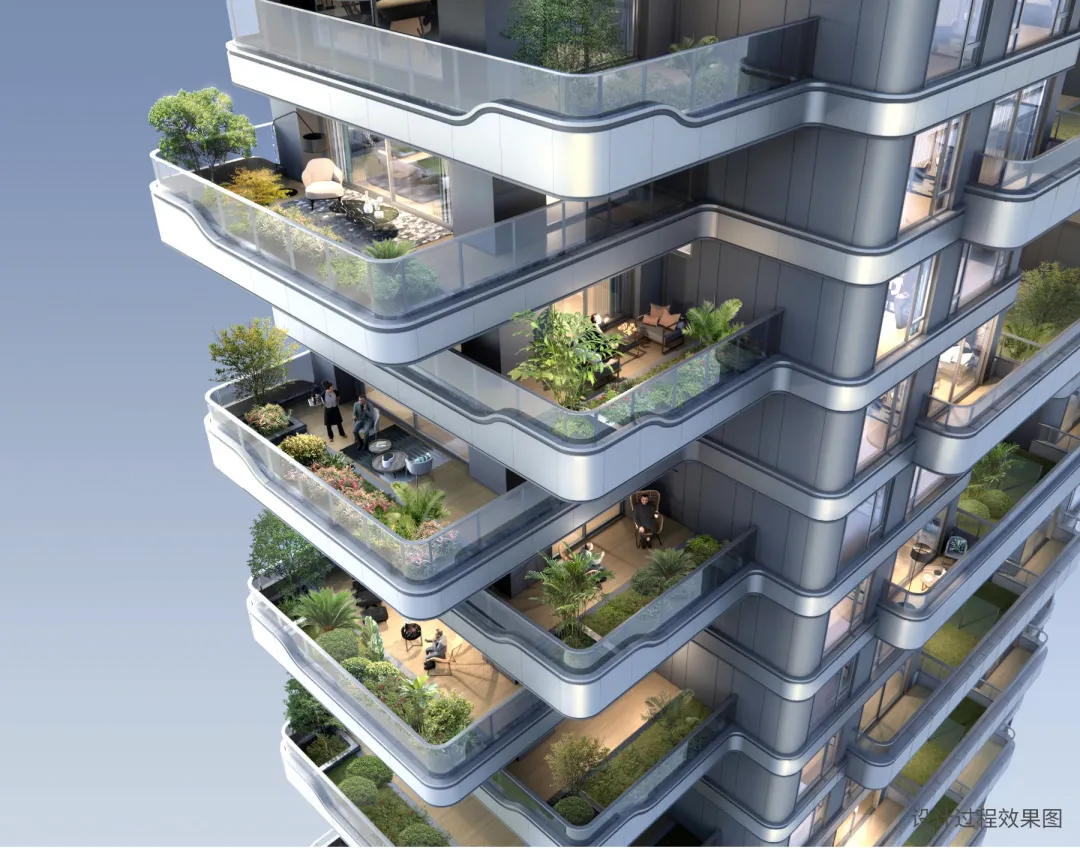 “立体”在于拥有立面与自然融合的“垂直森林”,“生态”在于让每家每户都有一座“私家空中花园”。创新性生态立面设计颠覆传统住宅立面的平铺直叙,在统一的序列中寻找自然的律动与和谐。