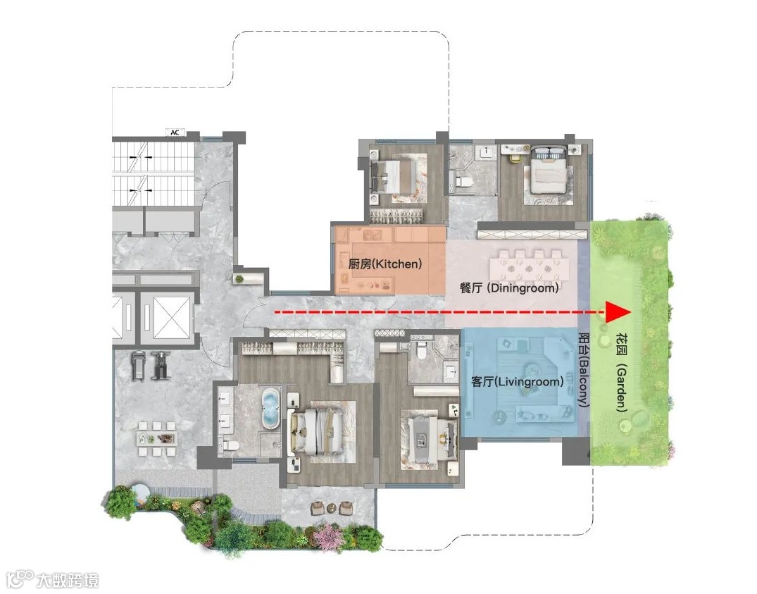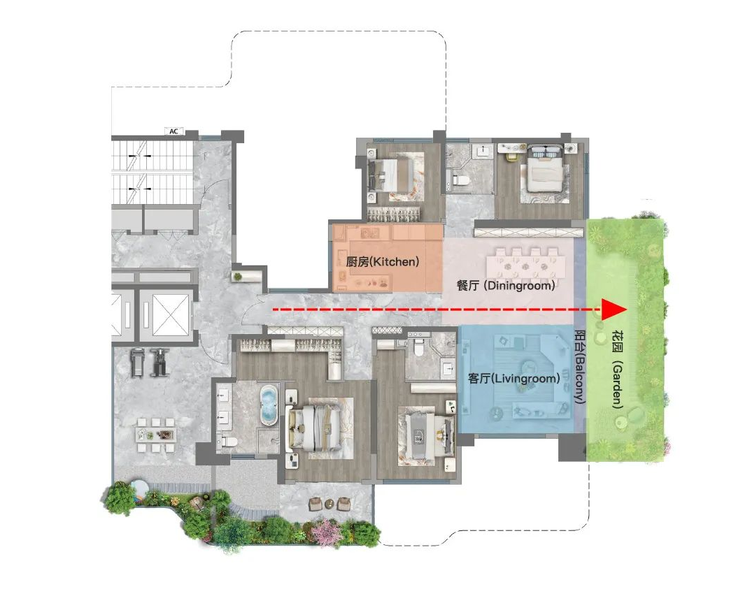270°生态景观花园——两层高私家花园始终围绕客餐起居空间,配以超大落地窗,天空和江景一览无余。