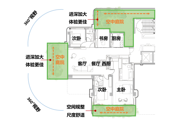 每一层住户都可以从客餐厅任意位置进入私属空中花园,无差别体验新型生态住宅带来的阳光和空气。