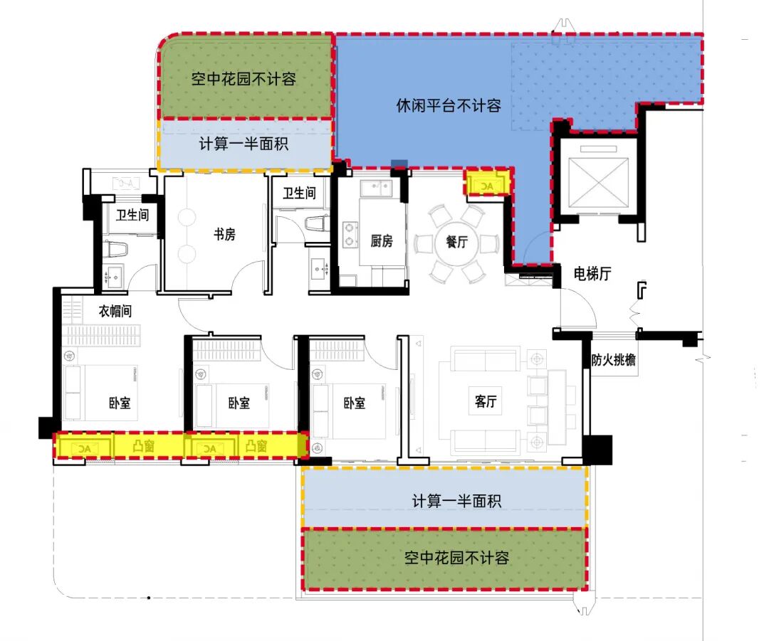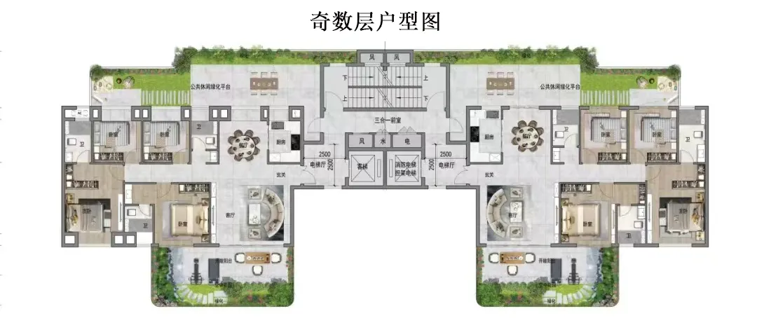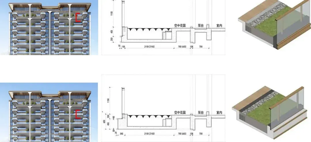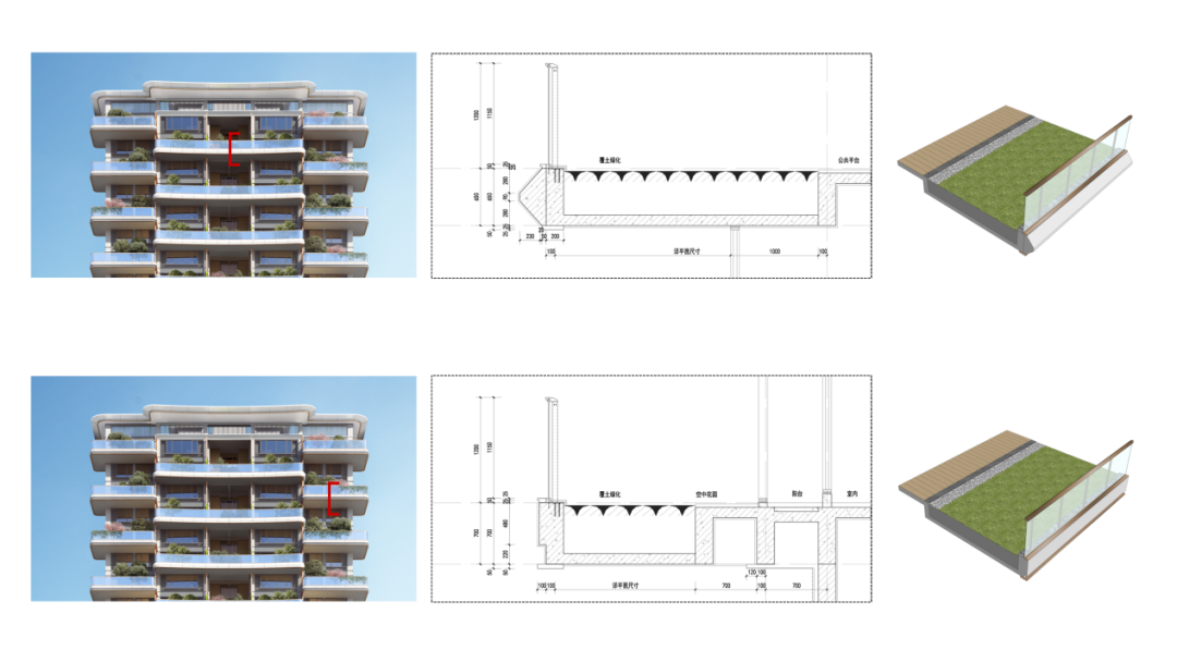 每户超大公共平台与空中花园,奇数层是南公共平台与南空中花园组合,偶数层是北公共平台与北向及山墙向空中花园组合。