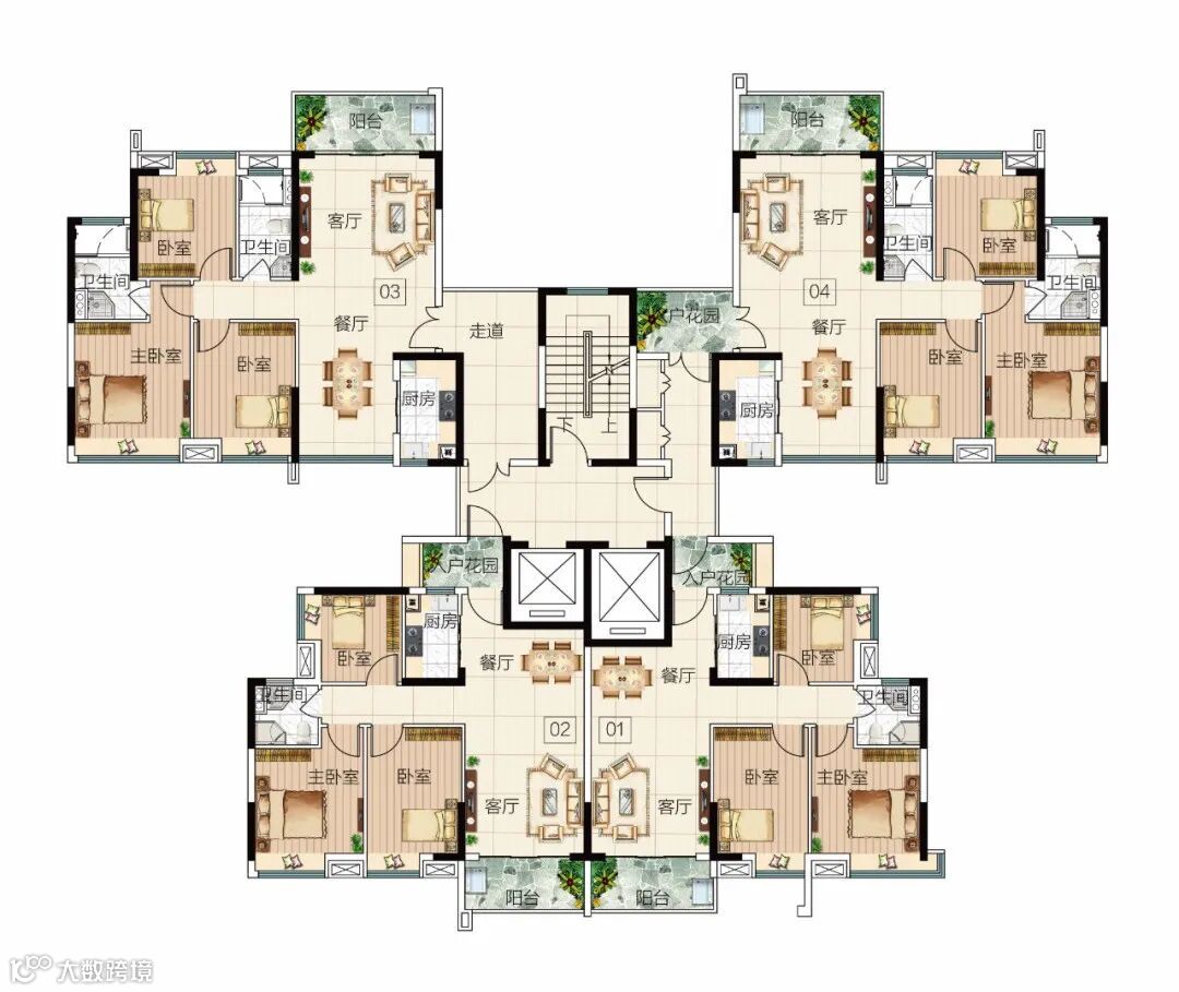 在总图设计中,体量形态大方向确认后,可以对户型进行设计优化。作为建筑师对户型面宽和进深关系应有比较深刻的认知,理解户型内部布局的基本特征,这样可以兼顾居住空间,外部环境的舒适度。(笔者在《户型设计?平面布局分析之一 | 平面逻辑》和《户型设计?平面布局分析之二|叠墅类产品平面逻辑及创新方向思考》二文中论述过户型设计的限制条件及设计思路,这里可供大家交流。)在此基础上,将总图的体量与户型设计的基本约束条件搭接,完成体量和户型之间的整合。此外,户型在总图中的分布需结合场地内外的优质环境进行合理布局,如边厅户型朝向中心景观、外部优质景观等等。