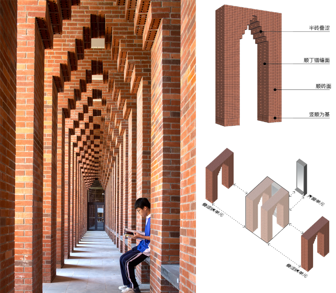 砖这种传统材料因为混凝土材料的发展表现出了更大的潜力,依托于钢筋混凝土作为承重结构是现代砖建筑最常采用的形式,燕川中学建筑主体采用陶砖,首层立面、窗台、连廊及顶棚等采用清水混凝土,砖与外露的混凝土结构呈现出真实清晰的构造逻辑之美,同时陶砖的红棕色调和清水混凝土的灰交融交错,形成轻重交错,相映成趣的景象。