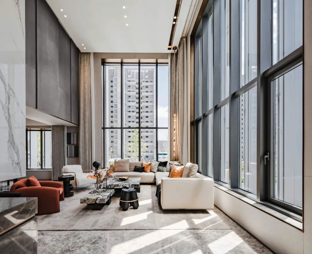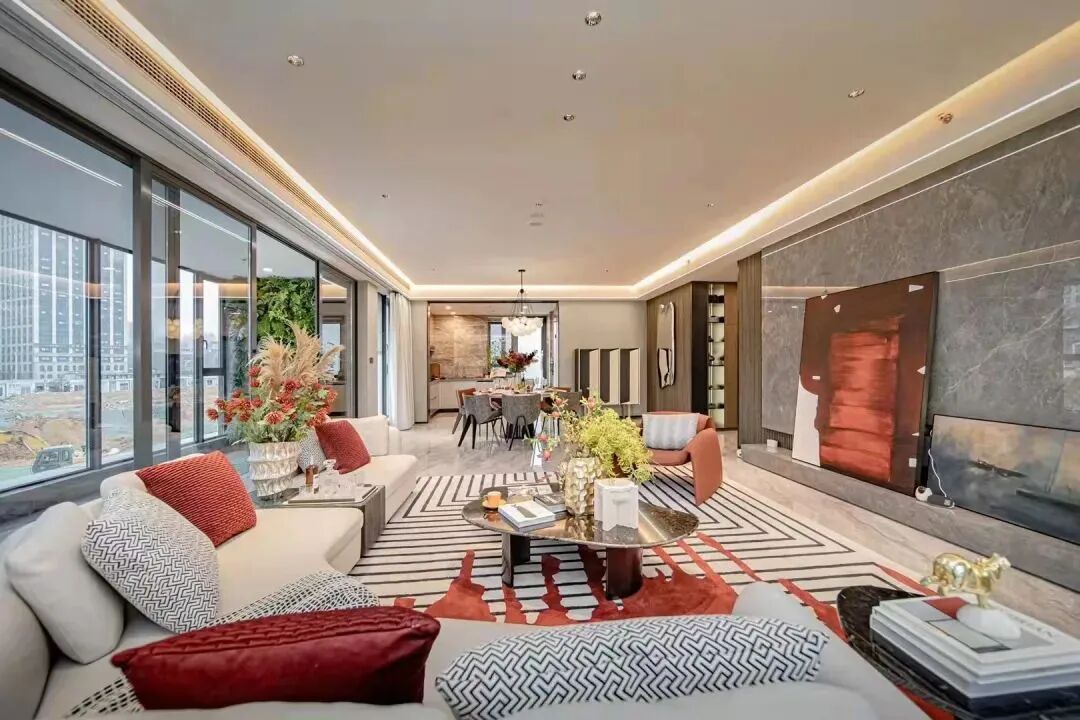 建面约142-310㎡新派科技豪宅,为了把外部景观资源充分引入室内,采用了“超大面宽+超高窗地比”的组合手法,感受优雅生活背后的细腻匠心。