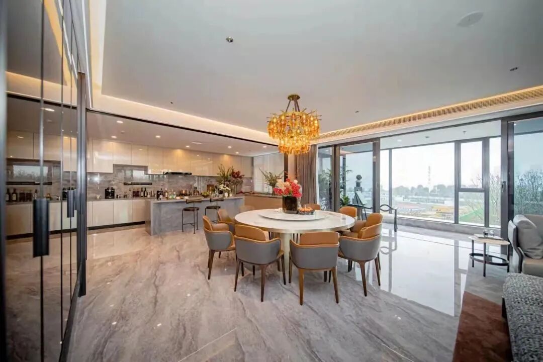 建面约265㎡户型,客厅、餐厅以及厨房的无缝相连,创新LDK竖厅设计,为家人们营造出宽敞而舒适的灵感生活剧场。在一体化无柱设计下,约19米连续开窗面赋予了空间270°的流光巨幕,让光影可以肆意在室内斑驳出通透的艺术美感。