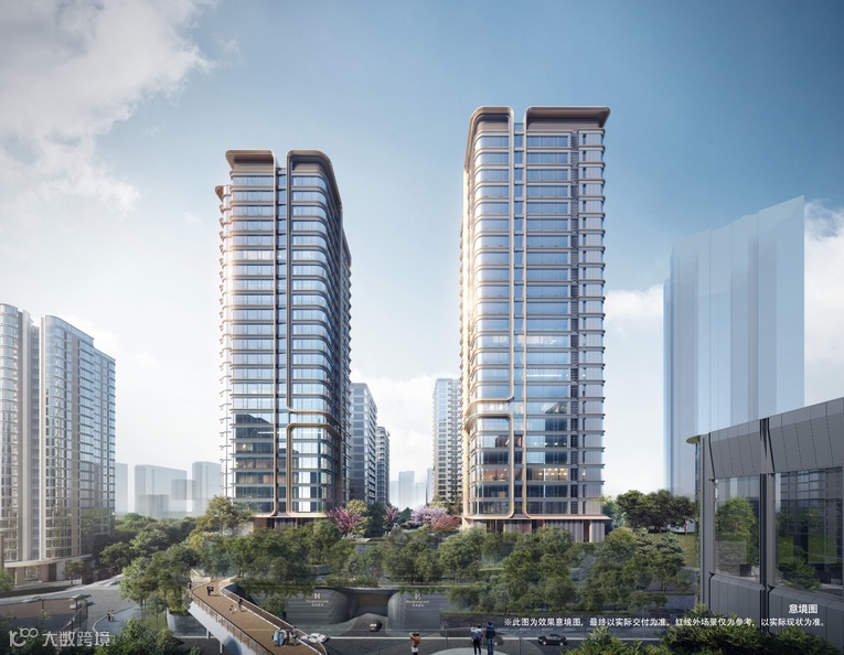 大流线,大曲率,成为极核区的第一眼建筑。源自英国设计师扎哈的灵感,融萃重庆现代人文风貌,以竖向飘带+流动曲线,勾描城芯优雅天际线。
