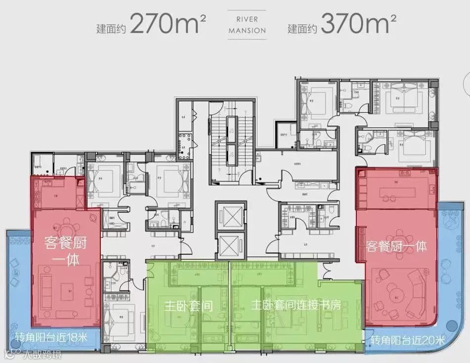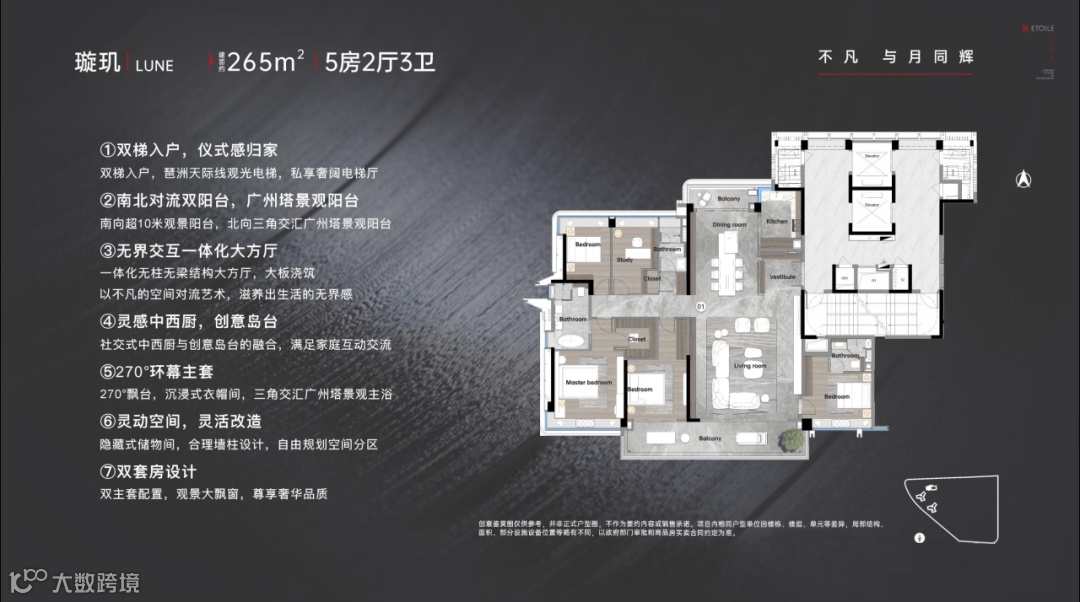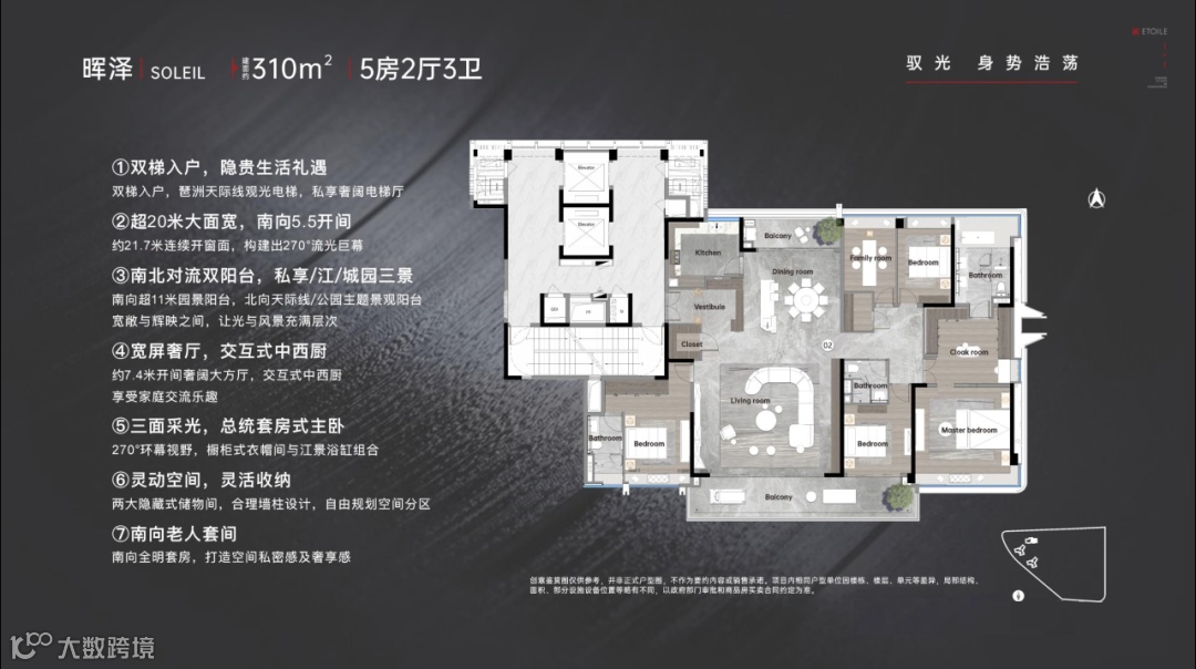 建面约262㎡户型,双电梯独立梯间,私密专属;大尺度厨房,可分离中西厨设计;大师定制全屋收纳、储藏间及衣帽间;超10m长阔景观阳台,270°MAX巨幕视野;双套间设计,全明采光,自带生活空间;大主卧浴缸+双洗手池,至尊体验。