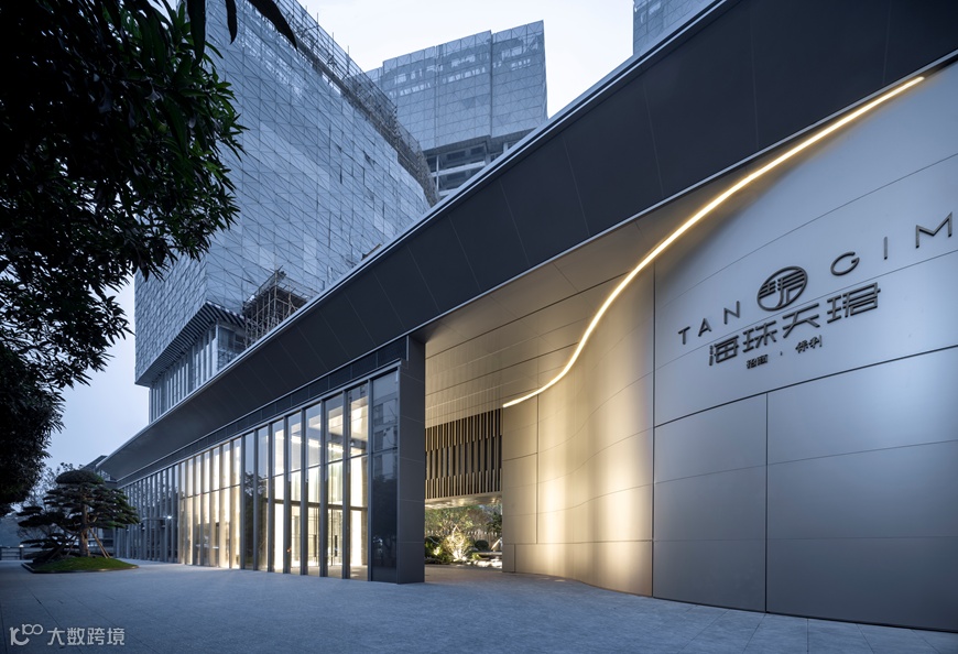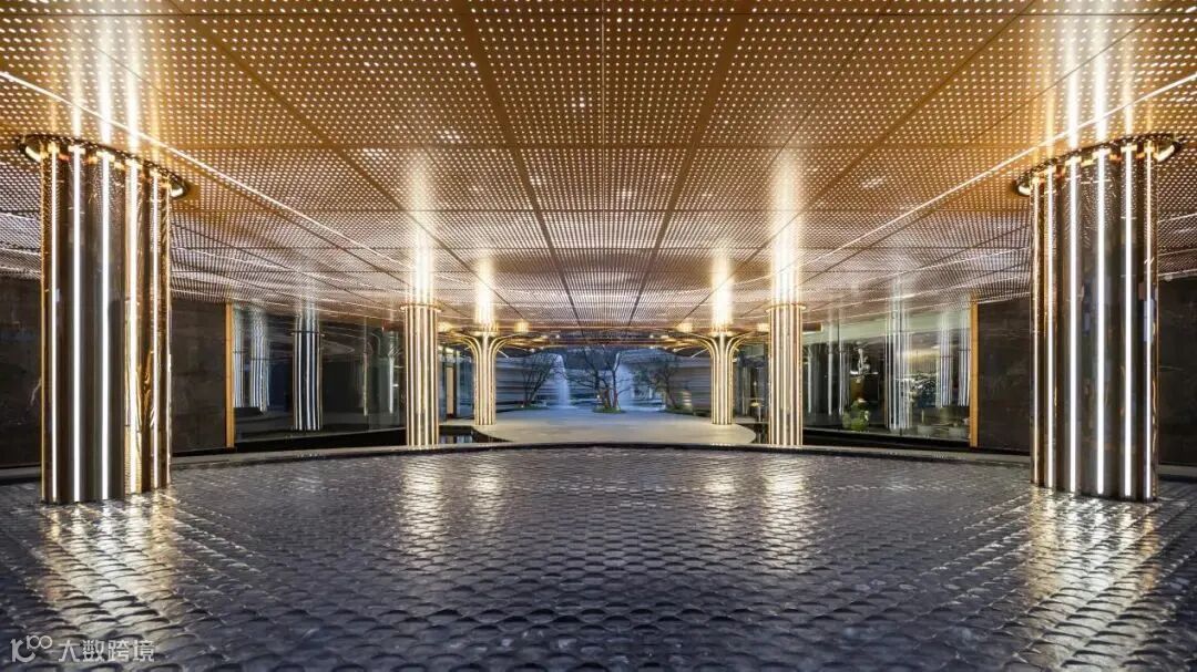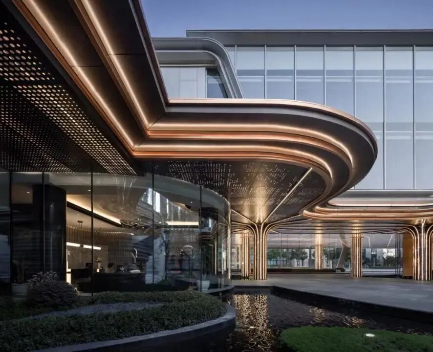 超白玻璃幕墙结合银灰色铝板,增强了建筑的通透性;金属格栅的设计,则打破了立面对称的标准,将整座建筑进行了分割,光影交错间更好地表达了结构的韵律;最后辅以香槟色线条点缀,增加建筑的轻盈感,构筑高雅而艺术的视觉审美体验。