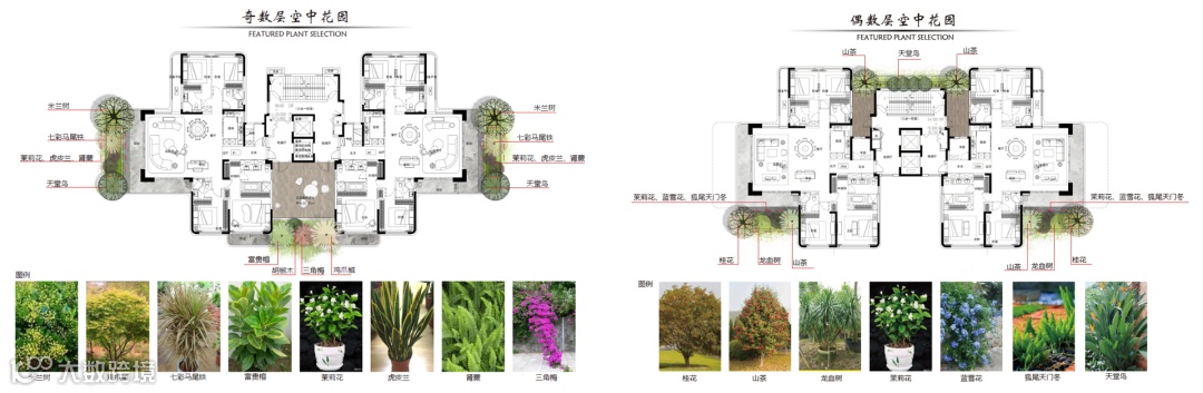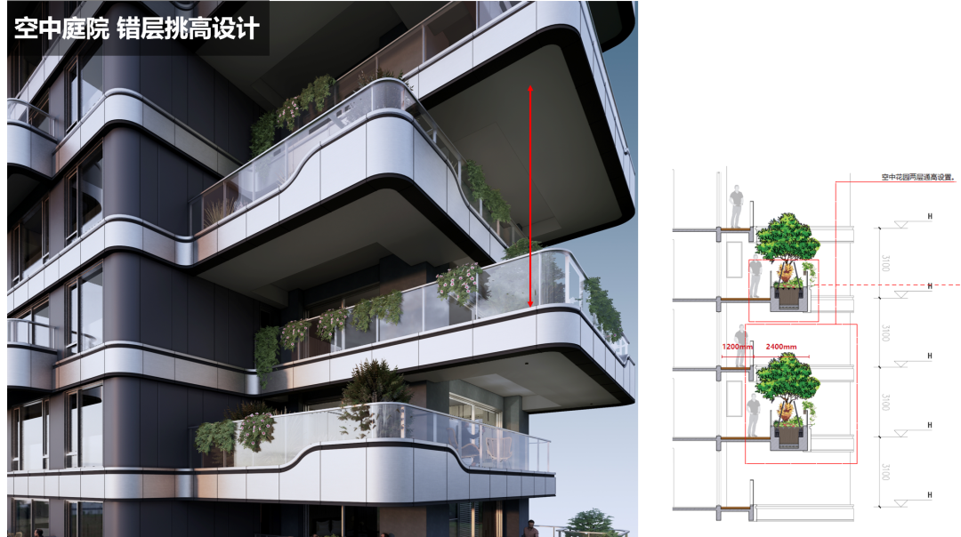 公共休闲绿化平台及空中花园,依据不同位置及高度,配置不同绿植。苗木搭配形态各异,随季节展现各自风貌。顶部造型构架下设置屋顶绿化,包含休憩花园、健康农场等绿化功能,满足居民休闲纳凉需要。同时,配置自动滴灌系统,实施24小时监测土壤水肥情况,精心呵护植物。