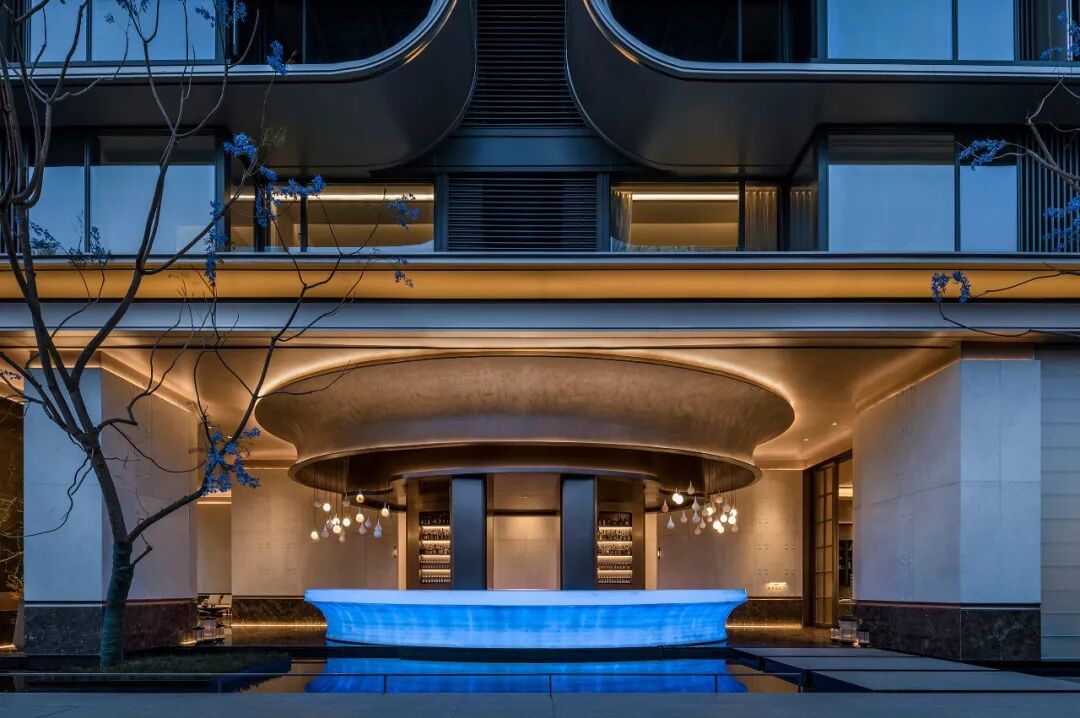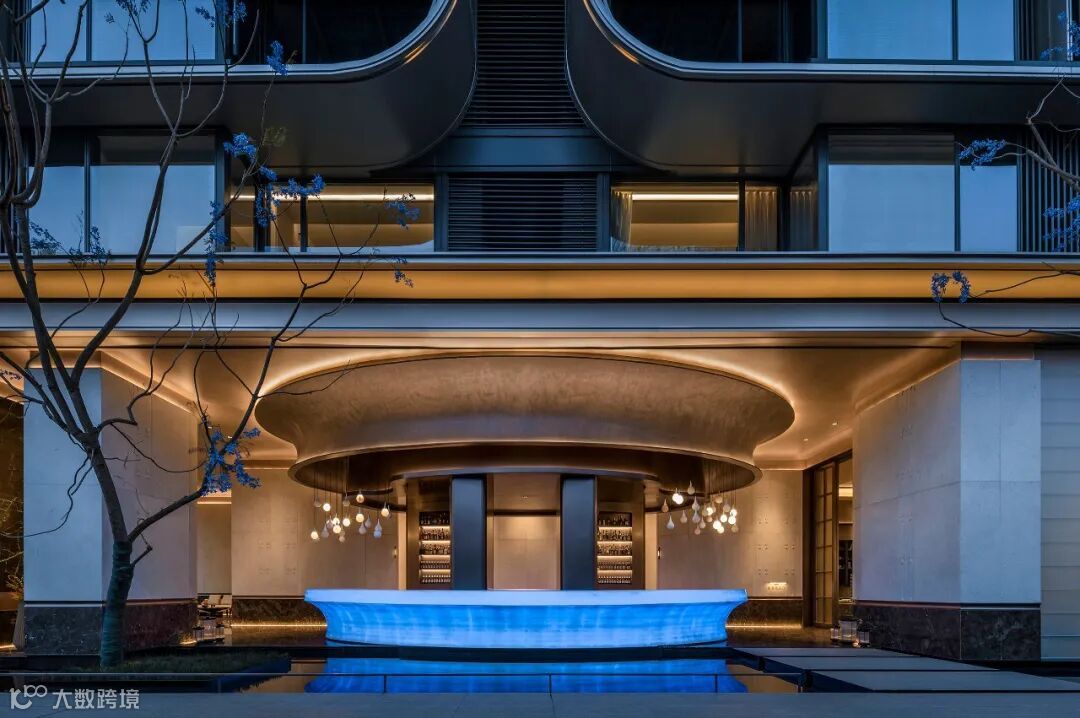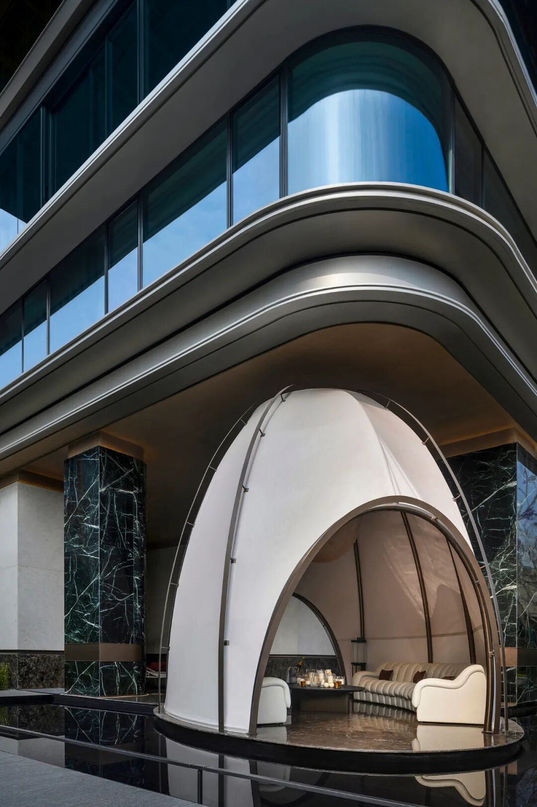 室内与室外景观、建筑的联系,则通过酒廊全面呈现。双曲面的吧台造型围合出圆形空间,模糊室内外的边界,将互动性与可观赏性充分释放,犹如整栋建筑的能量之源,供给其势能、滋养其养分,生生不息。