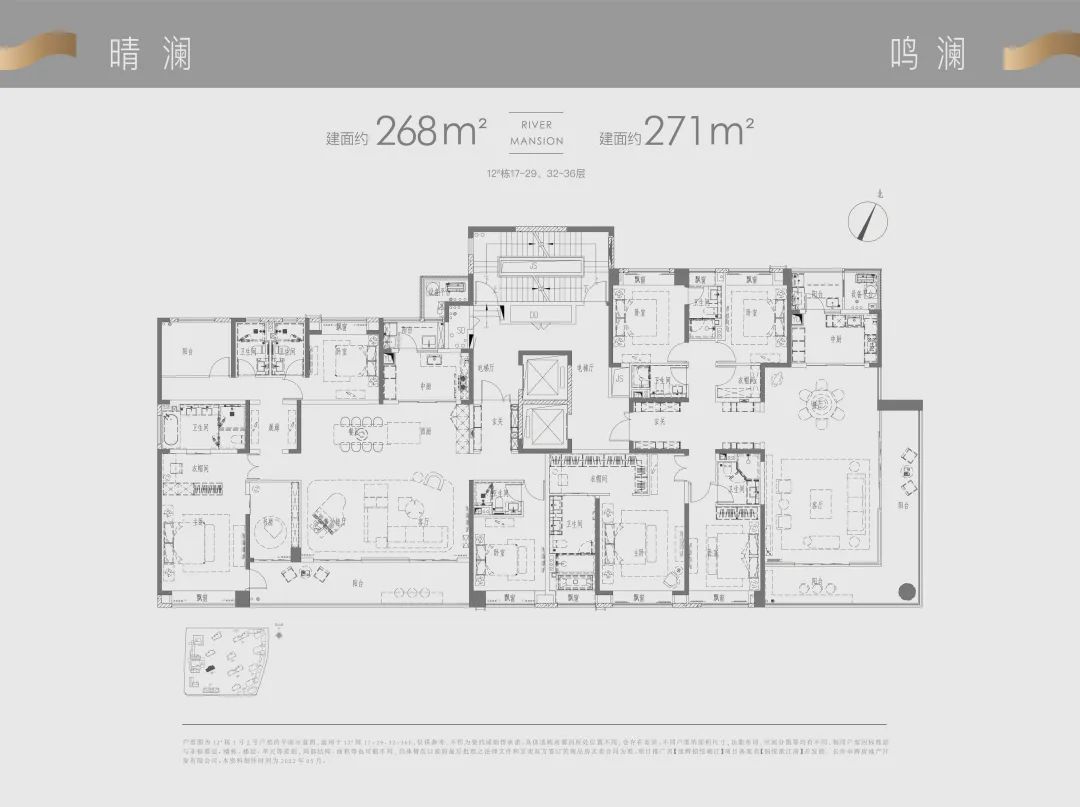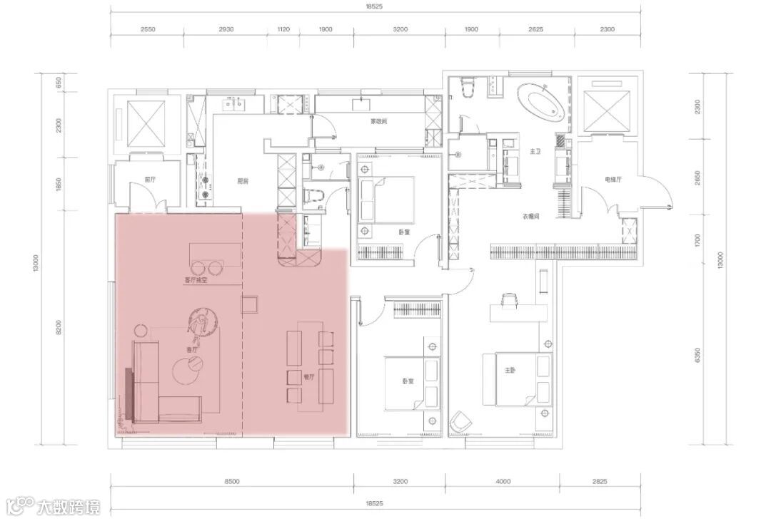 建面约268方的户型,方厅布局,开间约8.4米,进深约8米,超大尺寸下,餐客厅面积达到约67㎡,赋予了生活多变的可能。