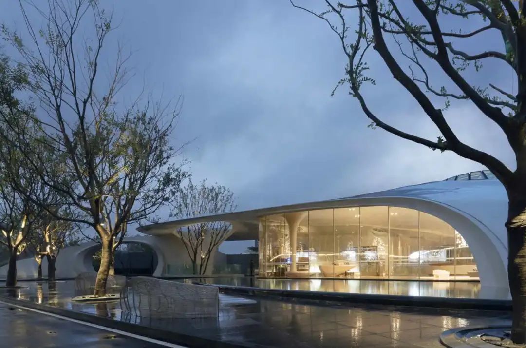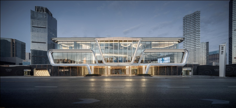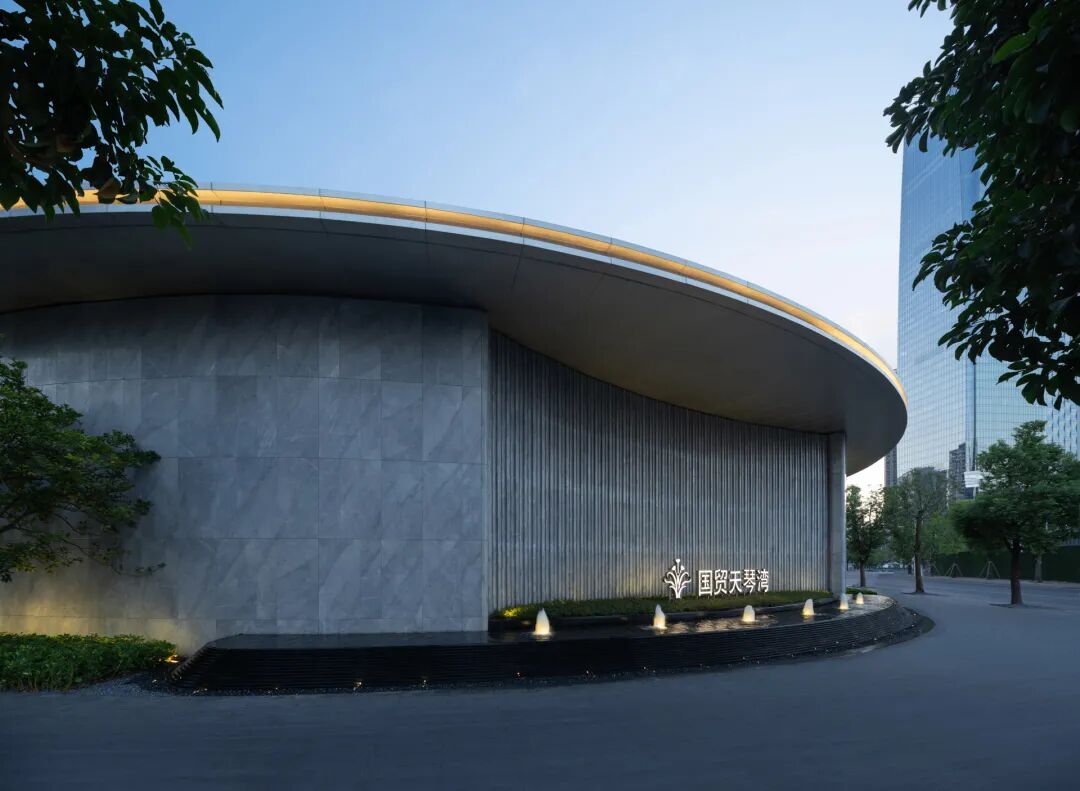 设计提取山水元素,融入到建筑设计之中。通过采用横线条构成,将“琴键式”设计语汇融合于建筑设计中。水平线条因曲线的融入被赋予了流动性,柔美的横向曲线与硬朗的铝板形成强烈的对比,将当代设计语言和精工工艺体现得淋漓尽致。