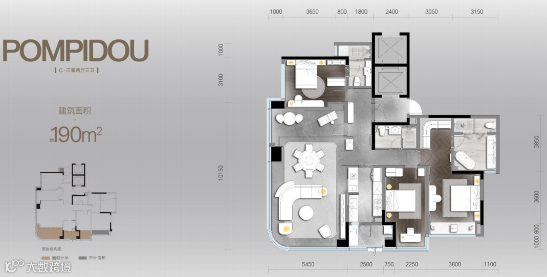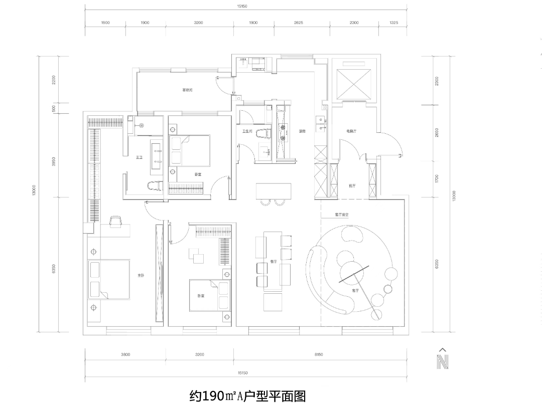 建面约190㎡户型三房两卫,转角边厅,餐厅后有一个可变空间。