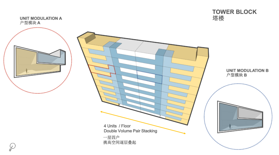 整个楼栋采用了创新L型的错层设计,如同积木一般地堆叠起来,用横平竖直的线条勾勒出简约方正的精工造型,就像一种充满未来感的几何式建筑,让人耳目一新。