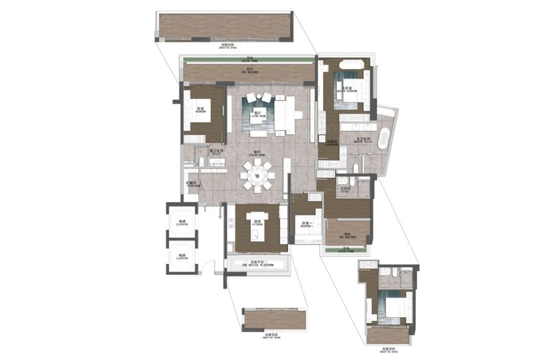 产品包含238平米及268平米两种端厅户型,每户均为私家电梯独立入户,穿过玄关空间,映入眼帘为面积近60平米超尺度客厅,满足复合功能现代生活需求。同时,客厅与室外私家花园紧密融合,花园成为室内空间的延续,人与自然无限接近。南向配置双主卧系统,北向设置儿童房及书房,同时户内拥有丰富储藏及收纳空间满足日常生活需要。
