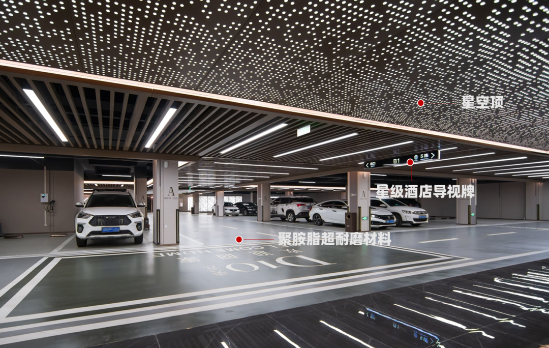 地下车库采取车道星光吊顶覆盖,智慧灯光引领业主归家。