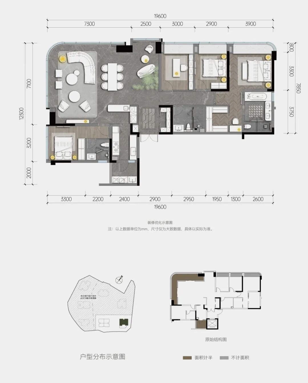 建面约142㎡四房两厅两卫,大面宽的一体化客餐厅,拓展了活动空间,采用全明空间设计,约13.3米南向全景采光面,既保证了充足的阳光,也能拥有更佳的观景视野。