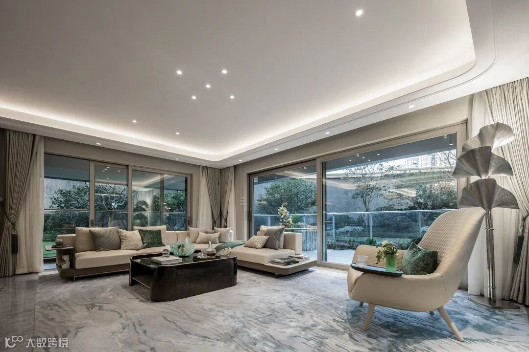 近11米长的南向客厅+餐厅,带进深约2.15米的宽景度假式阳台,搭配超大落地窗,真有《寄生虫》里大别墅的既视感。