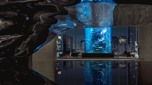 宽度约25米的大型中庭水景,中间是融入了宝格丽经典对戒风格的艺术雕塑。默默传递宝格丽之美的同时,蕴含中国独特文化内涵“四水归堂”,寓藏水聚天心、阖家团圆的愿景。