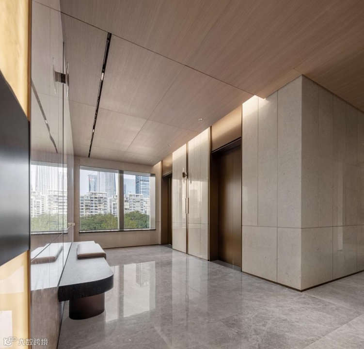 观景电梯厅实景图,候梯厅的面积达到了21.9㎡,且内部设置了新风系统