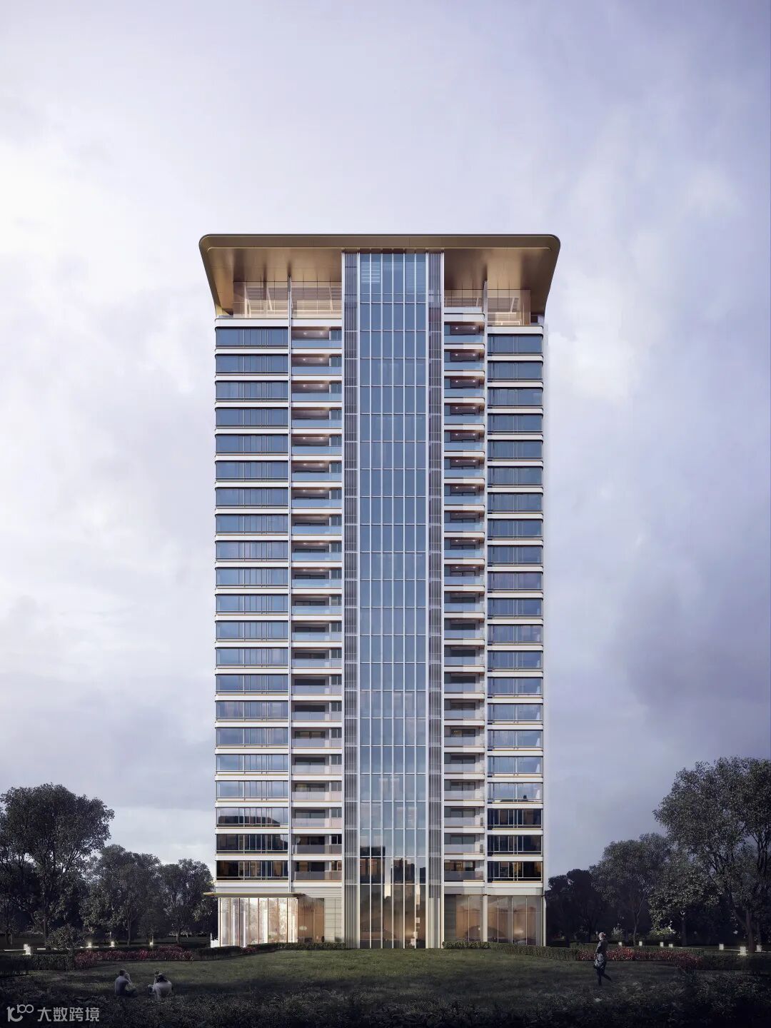 天樾玺住宅顶部,在铝板线条延续的同时,通高的玻璃幕墙填充装饰构架,在原有的建筑体块下,玻璃间用精致的金属型材进行划分,纵向比例进一步强化,形成显著的序列感与虚实关系,展现不凡气质。